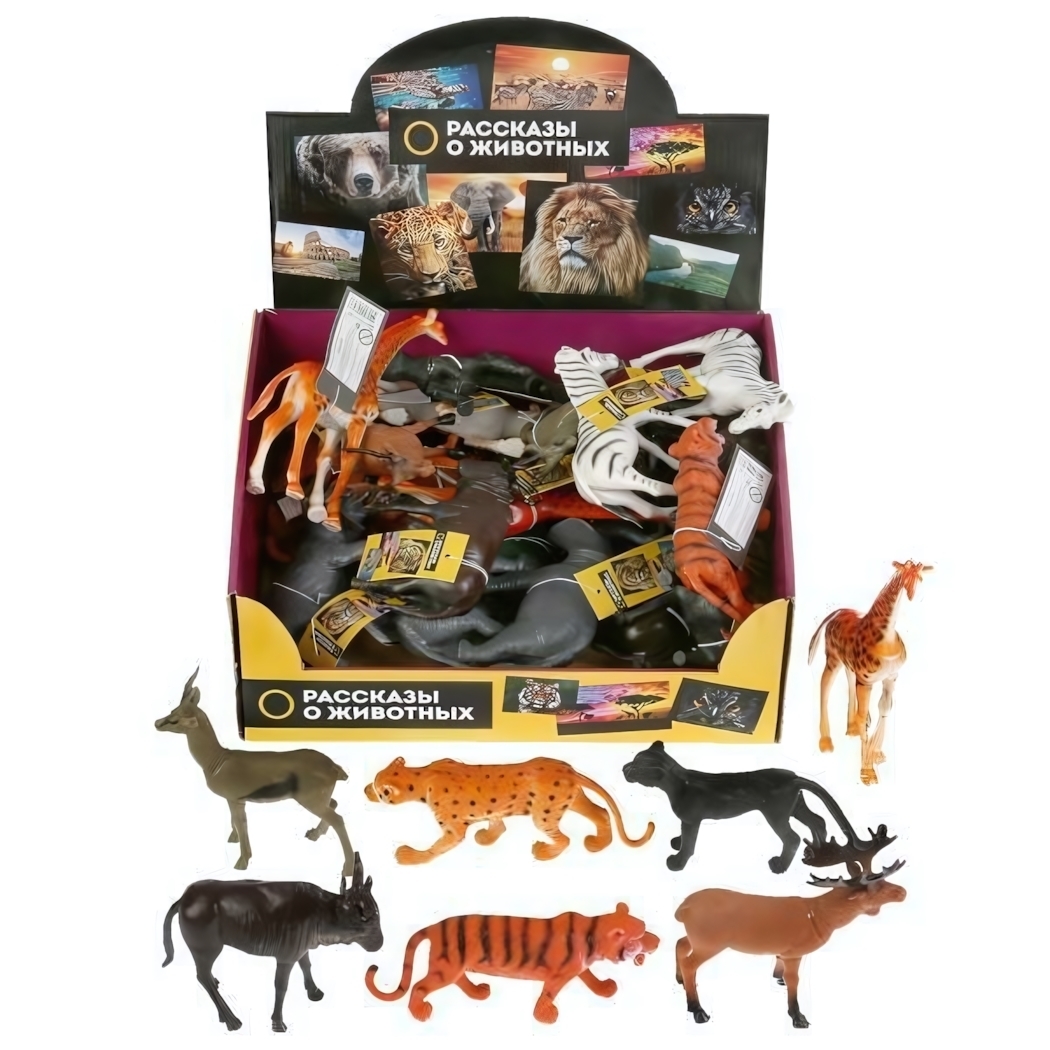 В набор входят 8 фигурок диких животных высотой 15 см: тигр, леопард, жираф, олень и другие. Материал — гипоаллергенный пластизоль, соответствующий требованиям ТР ТС 008/2011. Все элементы упакованы в подарочную коробку с красочным дизайном.