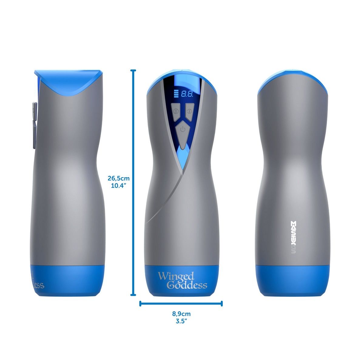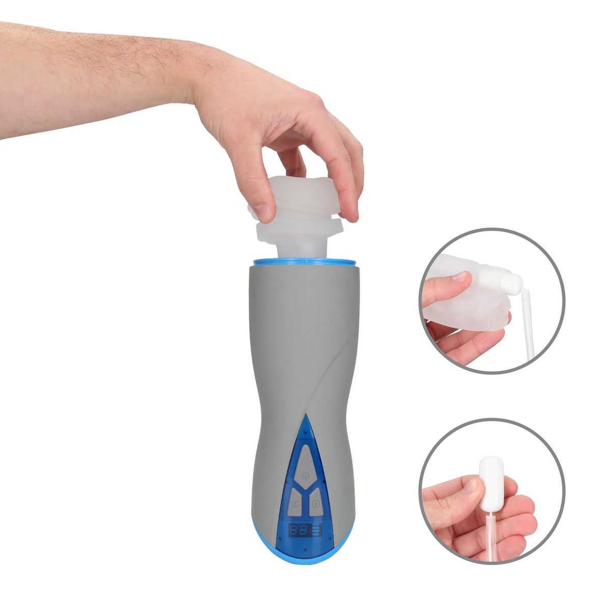Длина устройства составляет 26,5 см, цвет корпуса — серый с синими элементами. Мастурбатор оснащён встроенным аккумулятором и заряжается при помощи магнитного USB-кабеля. Подходит для индивидуального использования и разнообразия интимной жизни. После применения внутренний элемент можно извлечь для удобной очистки.