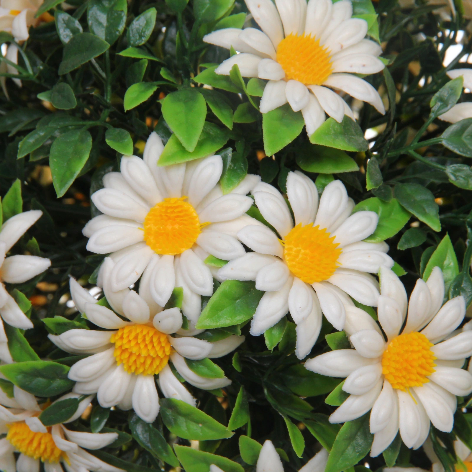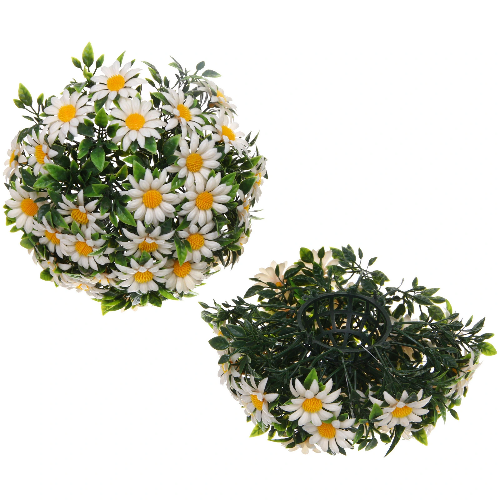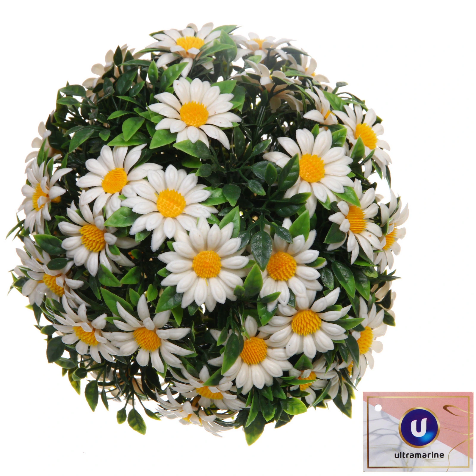 Шар имеет диаметр 20 см и состоит из двух половинок, которые легко собираются в единую композицию. Плотное покрытие из искусственных цветов и листьев скрывает основу, создавая эффект цельного живого шара. Белые цветы с желтыми серединками гармонично сочетаются с листвой разных оттенков зеленого, что делает изделие максимально естественным и привлекательным.