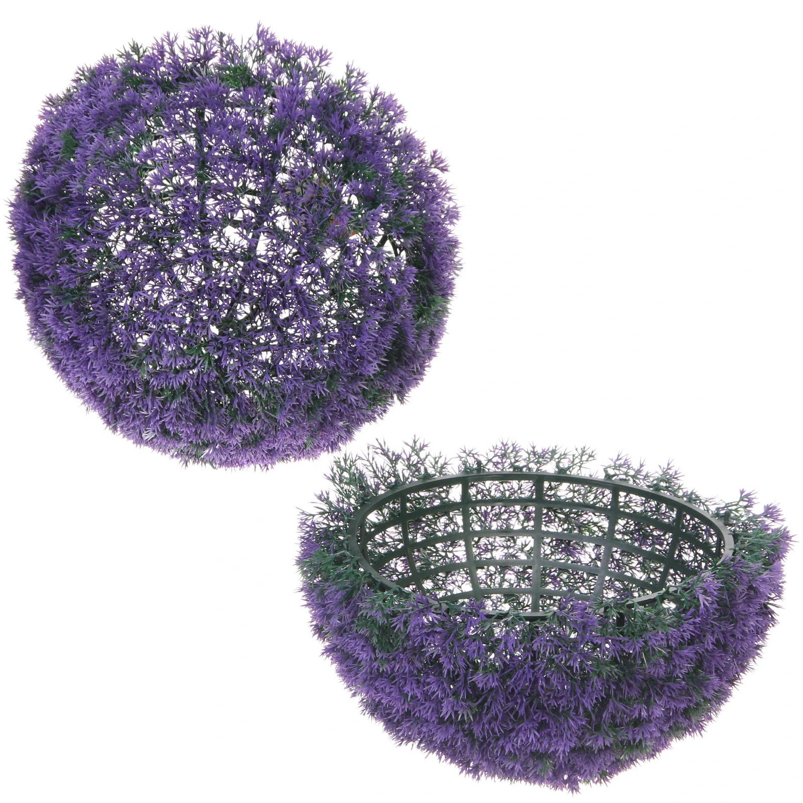 Шар имеет прочный внутренний каркас из решетчатой конструкции, который обеспечивает идеальную сферическую форму и долговечность изделия. Фиолетовые декоративные элементы закреплены на темно-зеленой основе, создавая естественный двухцветный эффект. Диаметр шара составляет 34 см, что делает его заметным, но не громоздким элементом декора.