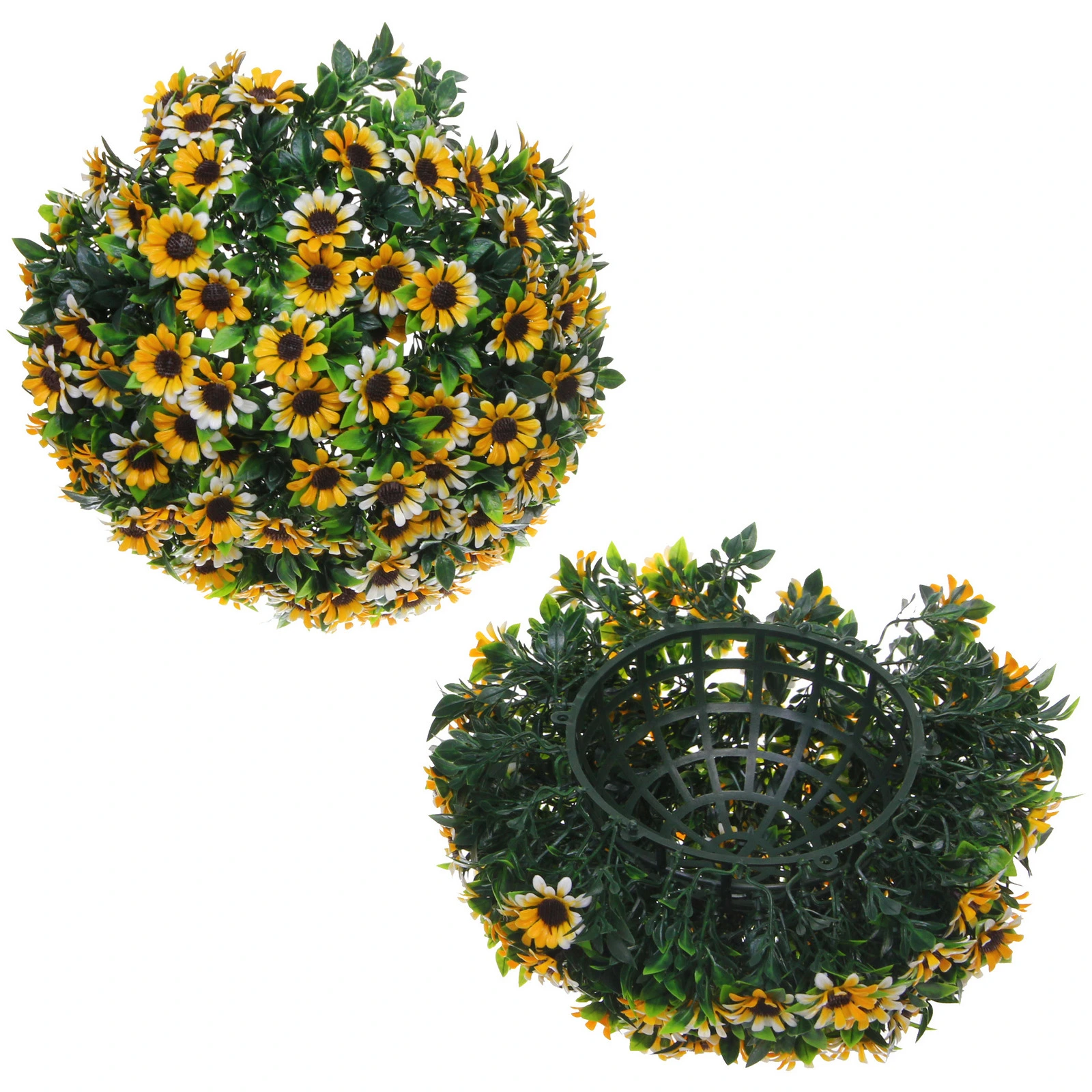 Шар имеет внутреннюю решётчатую основу зелёного цвета, к которой надёжно крепятся все декоративные элементы. Благодаря дренажным отверстиям внутри не скапливается вода, что особенно важно для уличного использования. Для очистки достаточно ополоснуть шар под струёй воды или протереть влажной тканью.