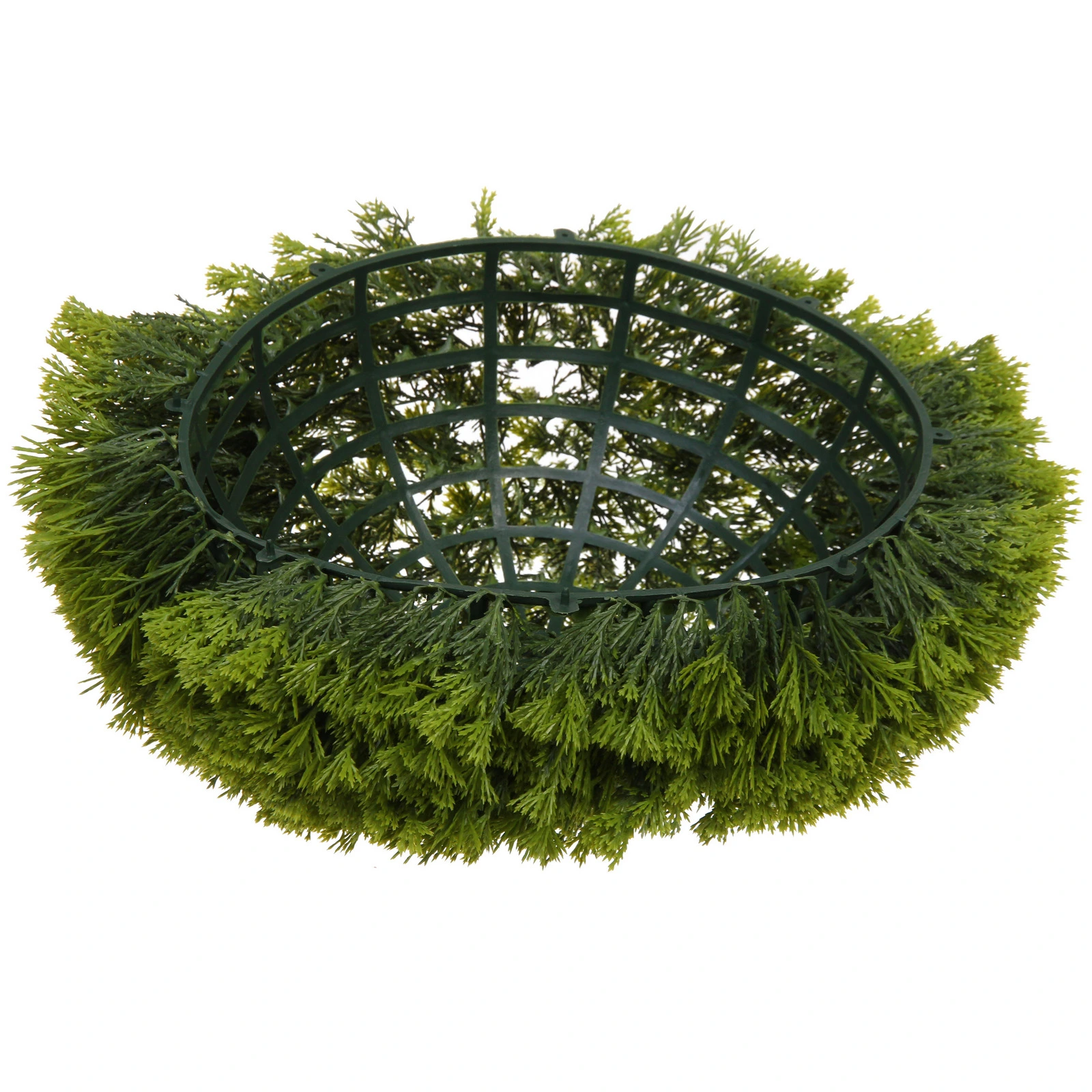 Шар поставляется в виде двух полусфер, которые легко и надежно соединяются между собой в единую композицию. В конструкции предусмотрено дренажное отверстие, благодаря которому вода не застаивается внутри при использовании на открытом воздухе. За растением очень просто ухаживать: оно легко моется под проточной водой и быстро сохнет, сохраняя насыщенный зеленый оттенок на протяжении многих сезонов.