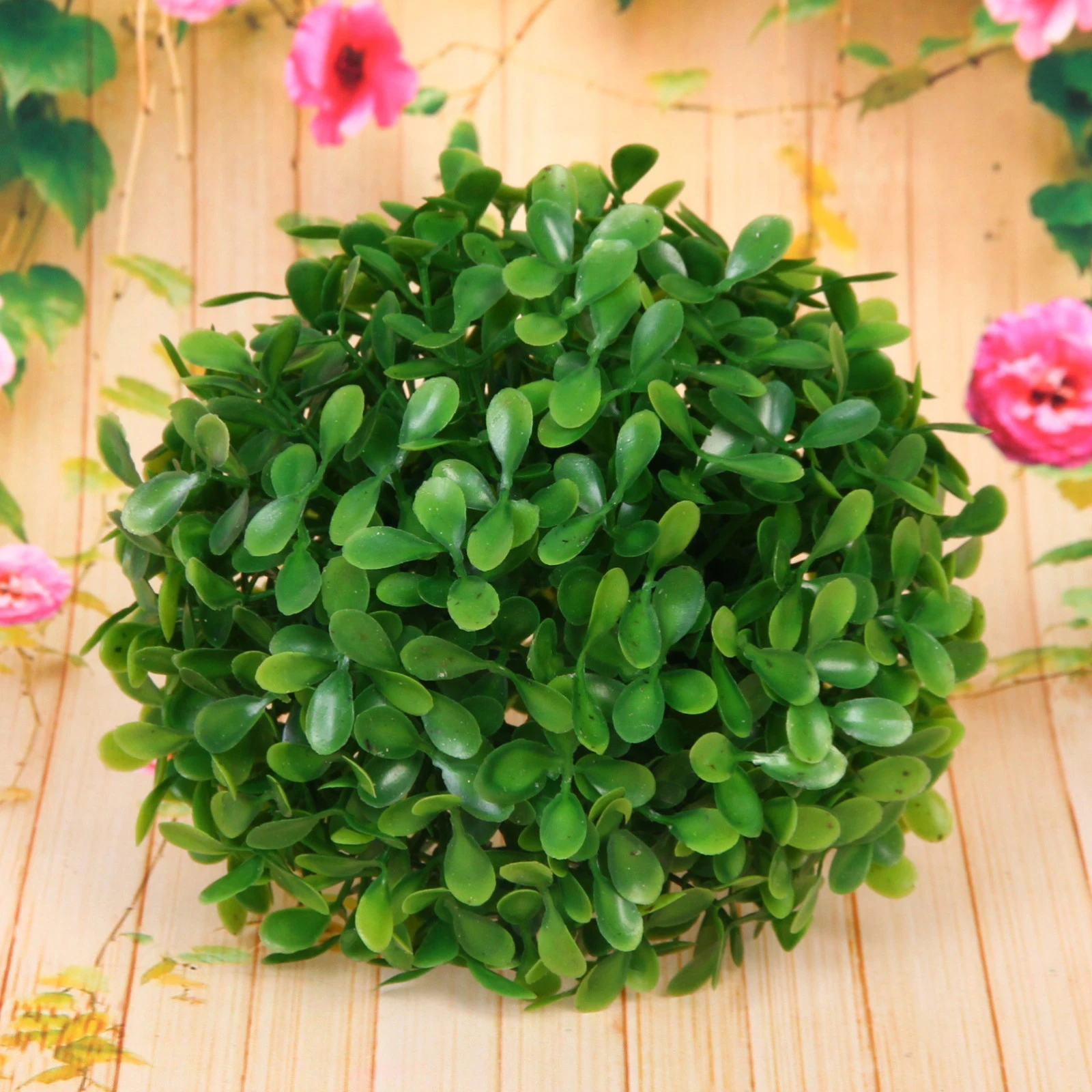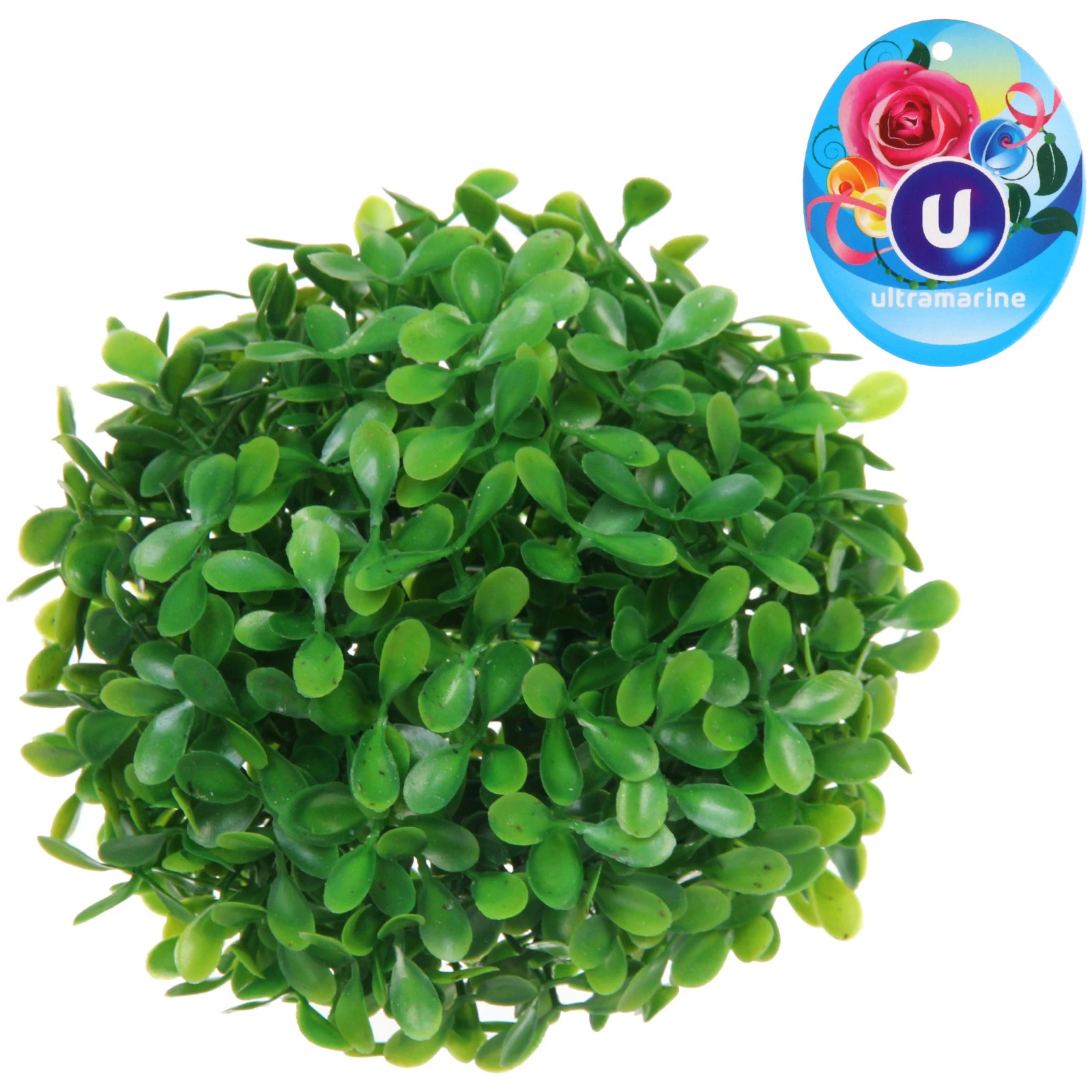 Растение представляет собой плотный шарообразный куст из множества стеблей с мелкими листьями. Диаметр шара составляет примерно 12 см. Листья имеют гладкую поверхность с легким глянцевым блеском и окрашены в различные оттенки зеленого, что добавляет натуралистичности. Материал изготовления — ПВХ, что обеспечивает легкость и упругость конструкции.