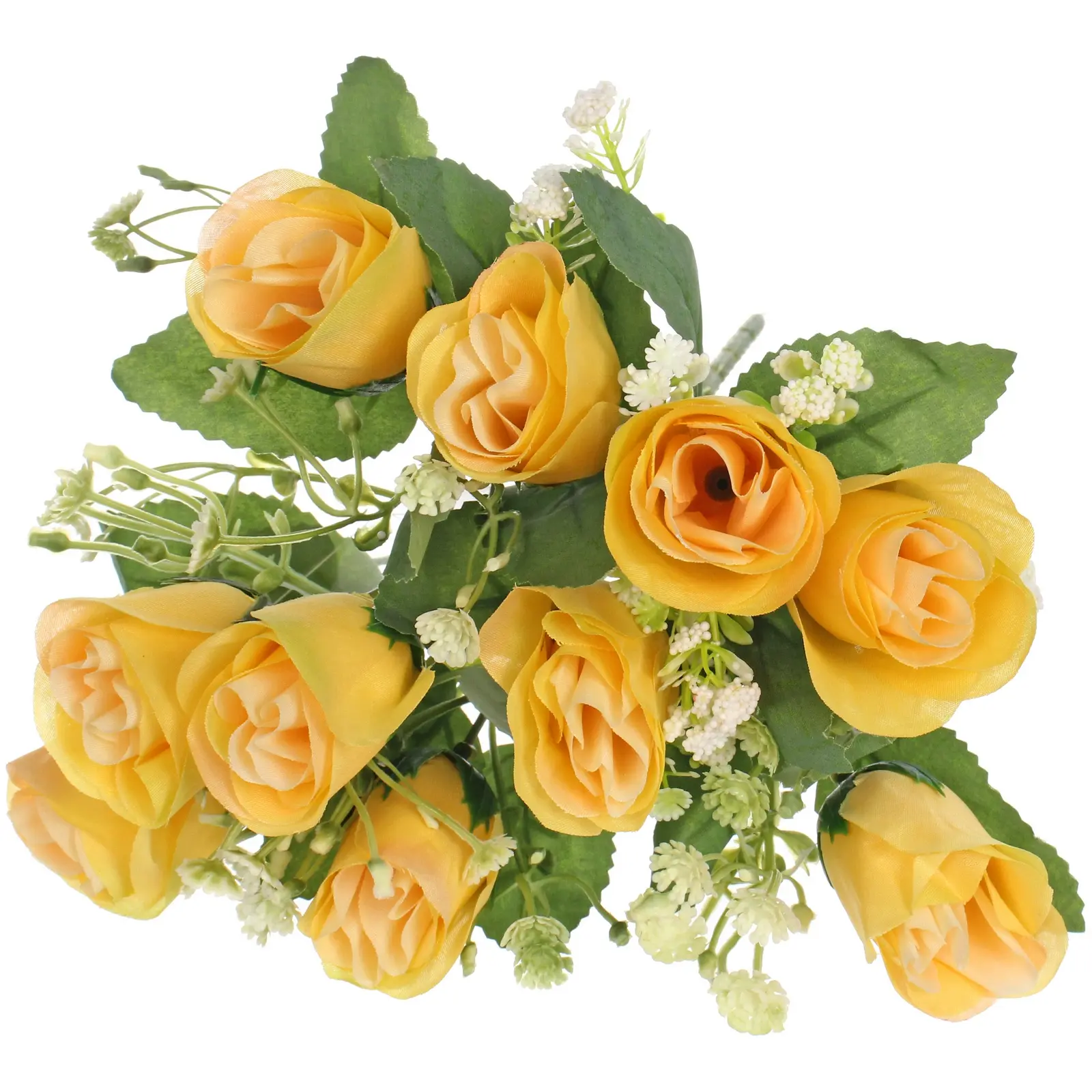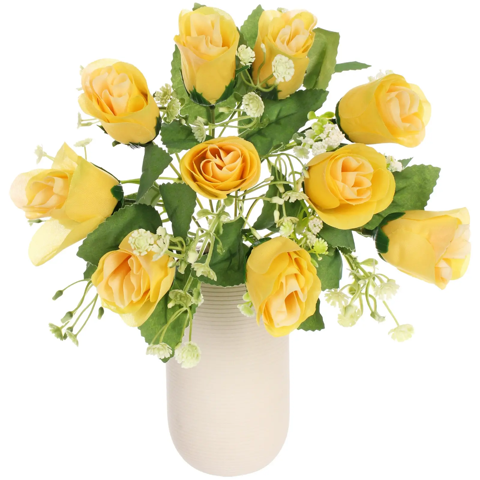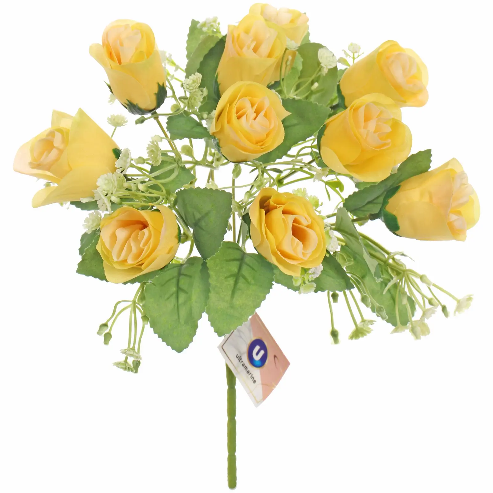 Размер букет — примерно 32 сантиметра, состоит из 10 желтых искусственных роз с белыми и зелеными добавлениями. Материалы: пластик и полиэстер, что обеспечивает приятную тактильность и долговечность. Цветовая гамма — яркая желтая с зеленью, что делает его универсальным для оформления любых помещений и подарков.