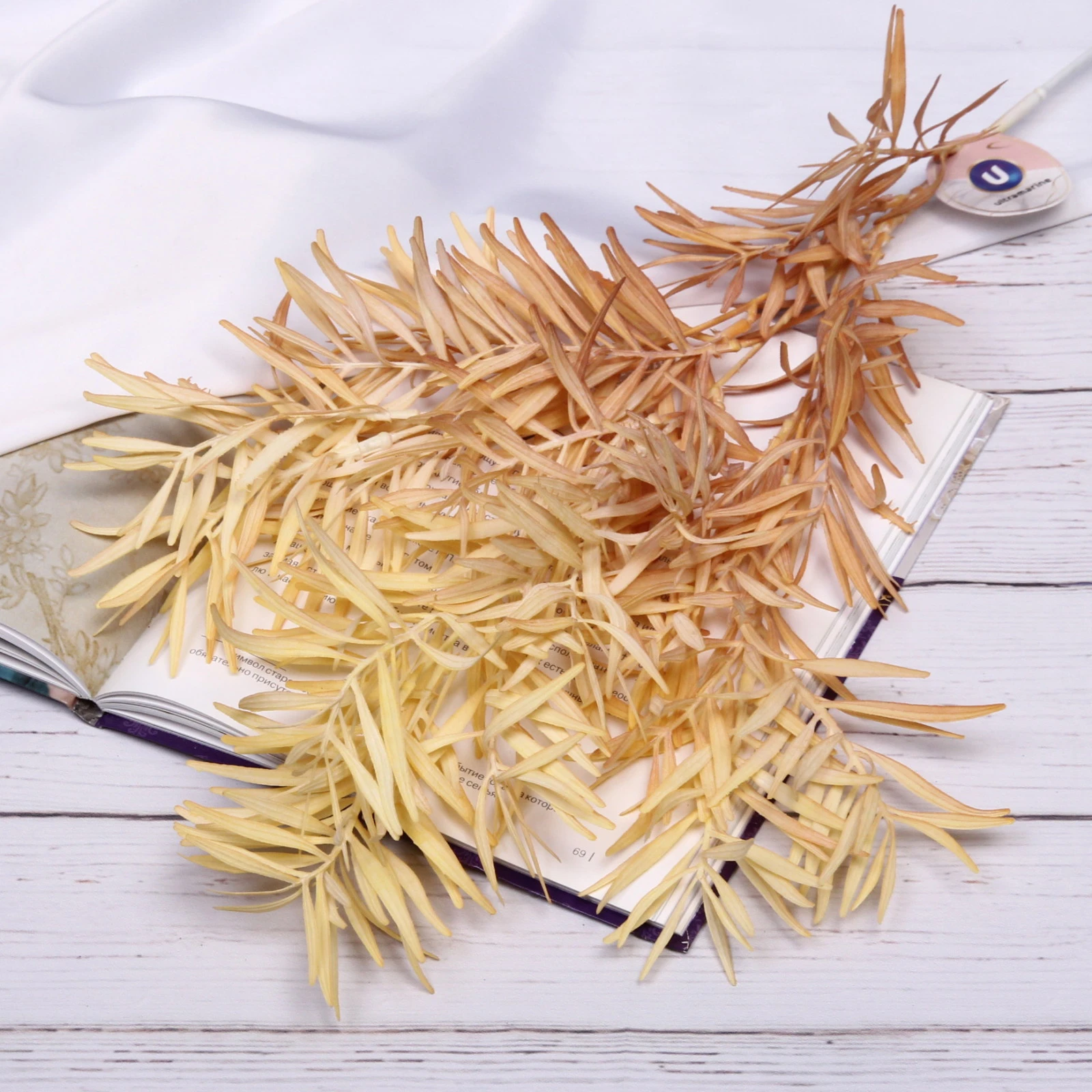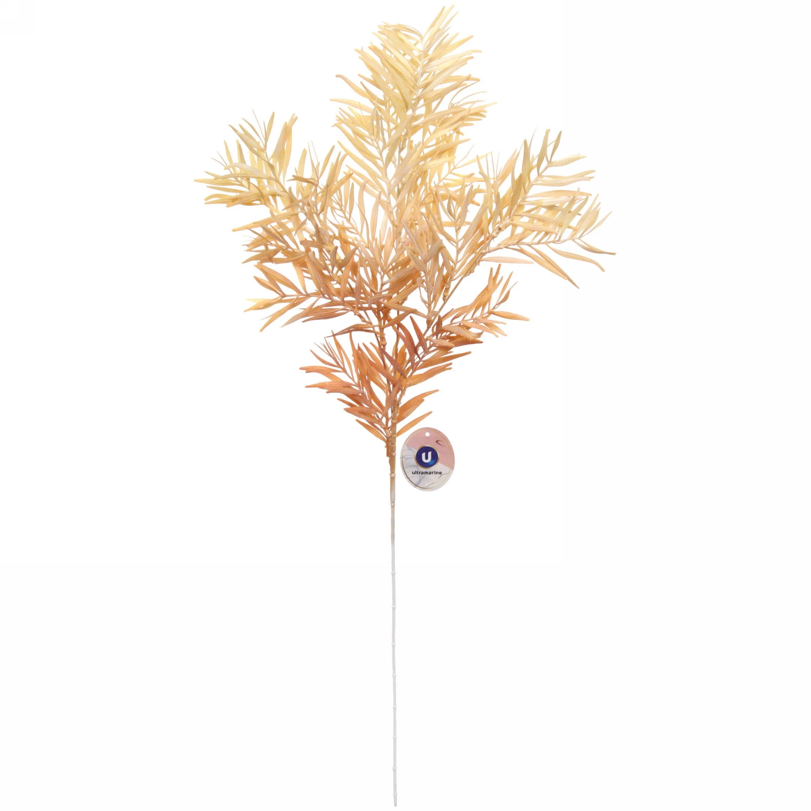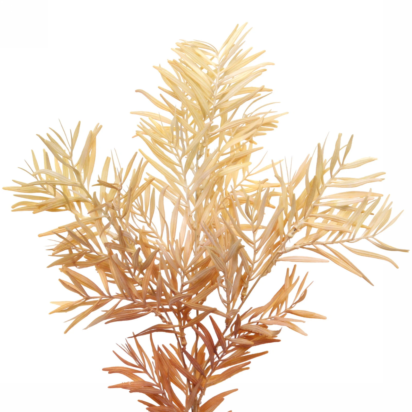Ветка с тонкими продолговатыми листьями станет изысканным акцентом в гостиной, спальне, офисе или кафе. Её можно поставить в высокую напольную вазу, использовать в составе настольной композиции или закрепить на стене для создания вертикального озеленения. Градиентная окраска от светло-жёлтого к тёплому персиково-бежевому оттенку выглядит невероятно естественно и добавляет интерьеру глубины и объёма.