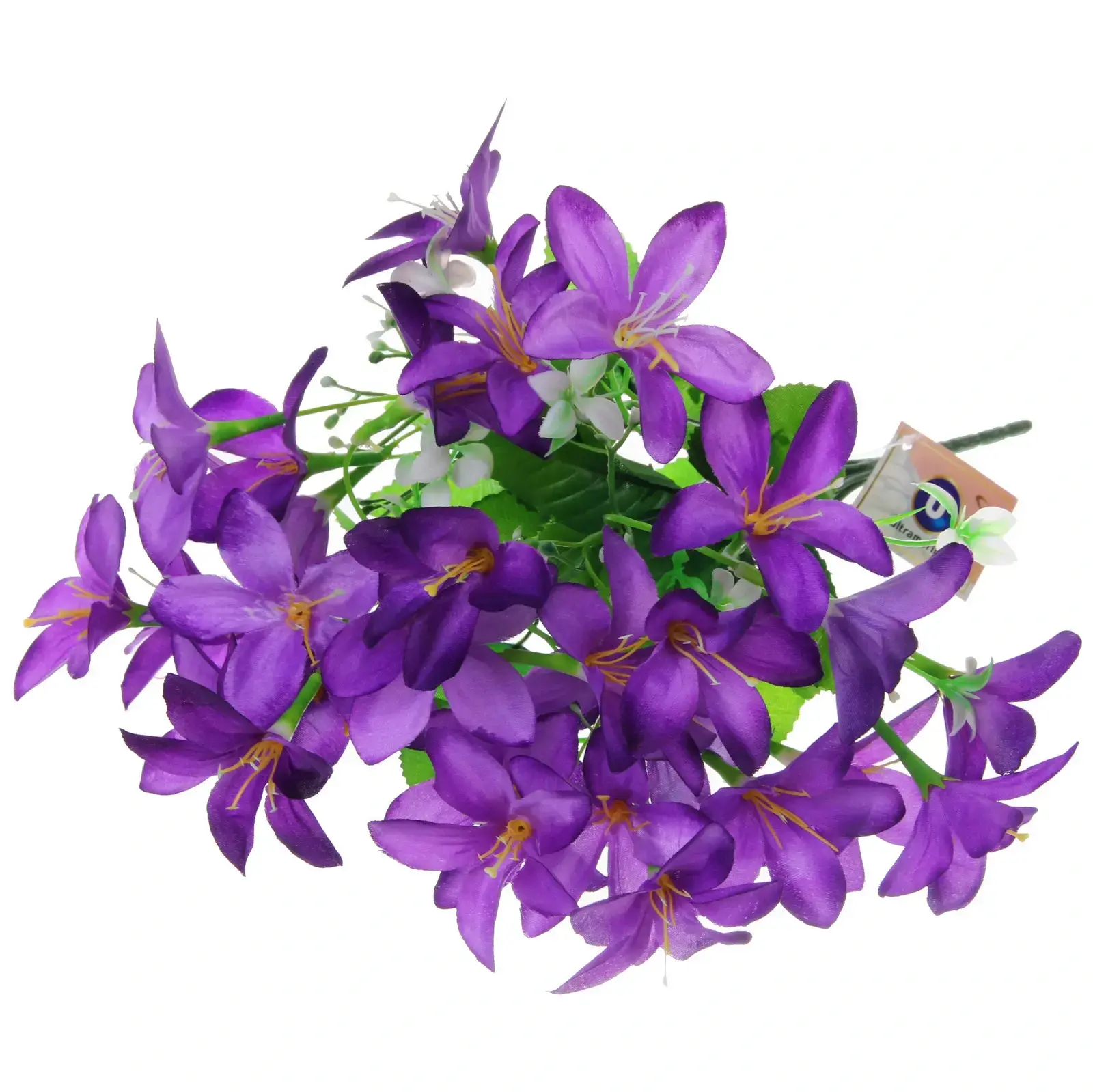 Цветы выполнены из качественных материалов: пластика и полиэстера, что обеспечивает их долговечность и реалистичный внешний вид. Фиолетовые лепестки с желтыми тычинками создают яркий и привлекательный образ, а зеленые листья добавляют натуральности. Высота букета составляет 40 см, что делает его идеальным для размещения на столах, полках или в вазах.