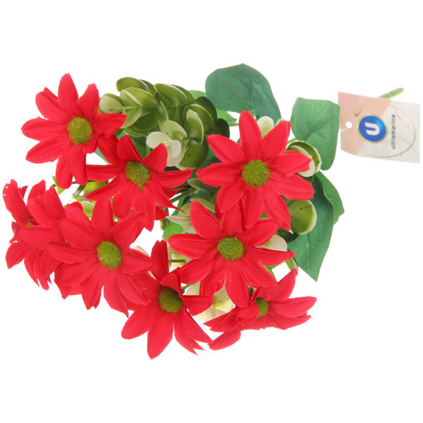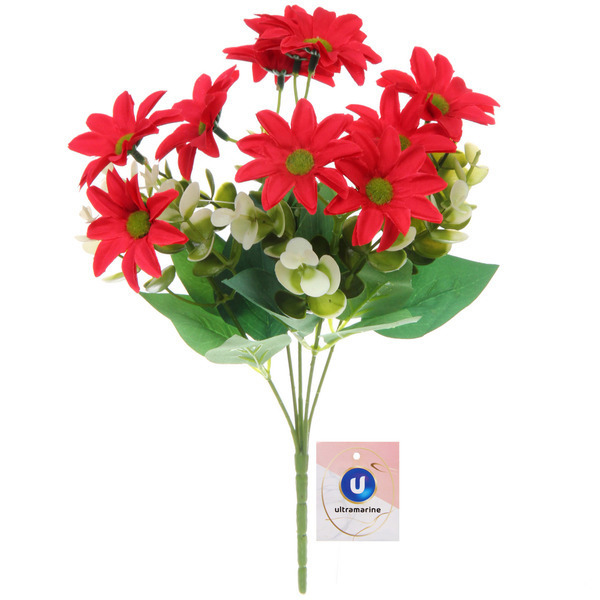Цветы выполнены из высококачественного пластика и полиэстера, что обеспечивает их долговечность и устойчивость к внешним воздействиям. Высота букета составляет 30 см, а насыщенный красный цвет лепестков с зелеными листьями придаст вашему пространству живость и яркость. Эти хризантемы станут отличным выбором для создания стильного и современного интерьера.