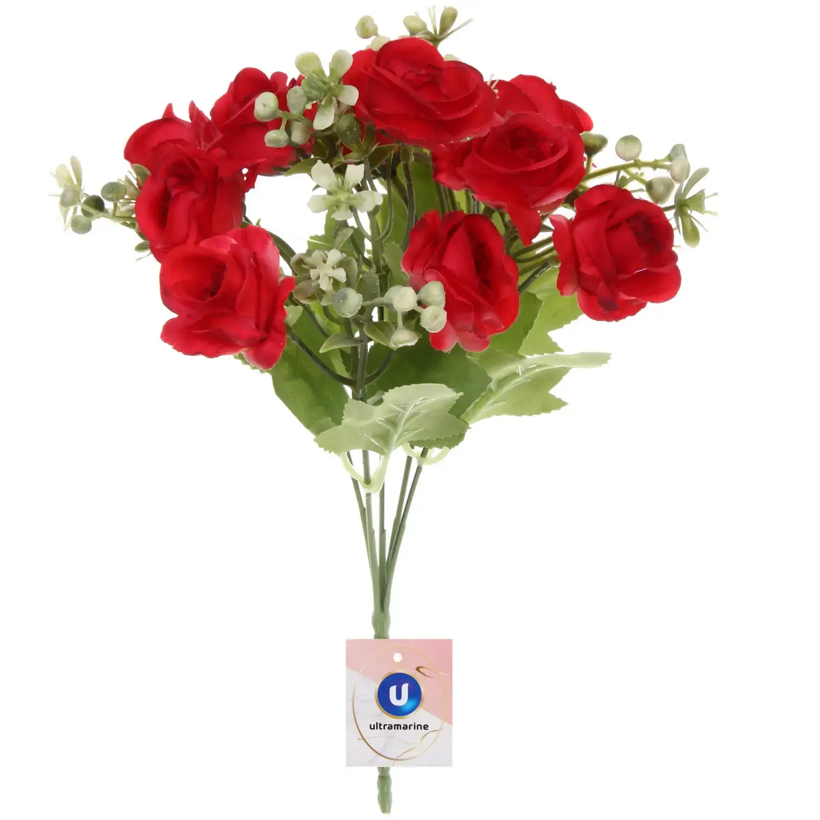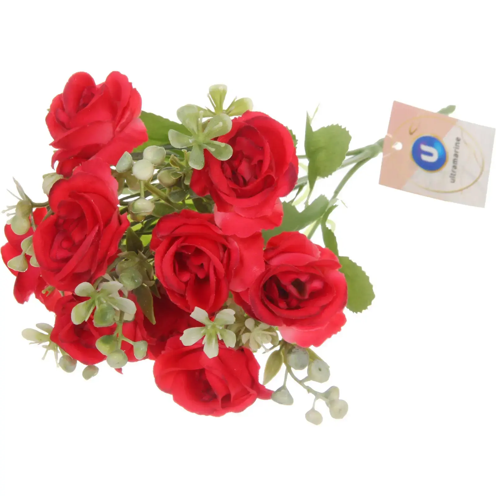 Букет из семи красных роз, дополненный зелеными листьями и мелкими белыми цветочками, прекрасно подходит для декора любого помещения. Вы можете использовать его для оформления праздничных мероприятий, создания уютной атмосферы в доме или в качестве подарка близким. Искусственные цветы легко комбинируются с другими элементами декора, что позволяет вам проявить свою креативность.