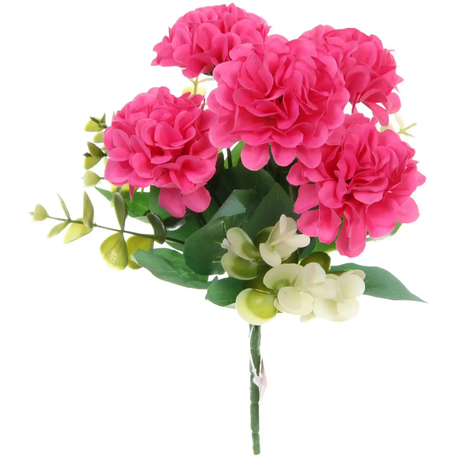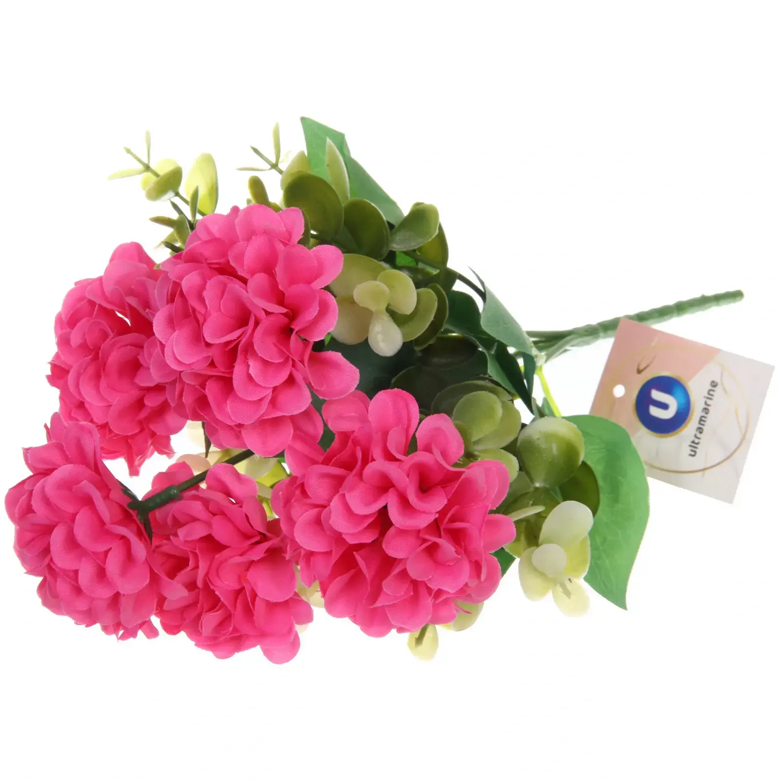 Букет состоит из нескольких крупных ярко-розовых цветков и зелёных листьев, выполненных из высококачественных синтетических материалов. Размер букета составляет 30 см, что делает его универсальным для различных стилей интерьера. Добавьте яркие акценты в ваш дом с помощью этого стильного и практичного букета!