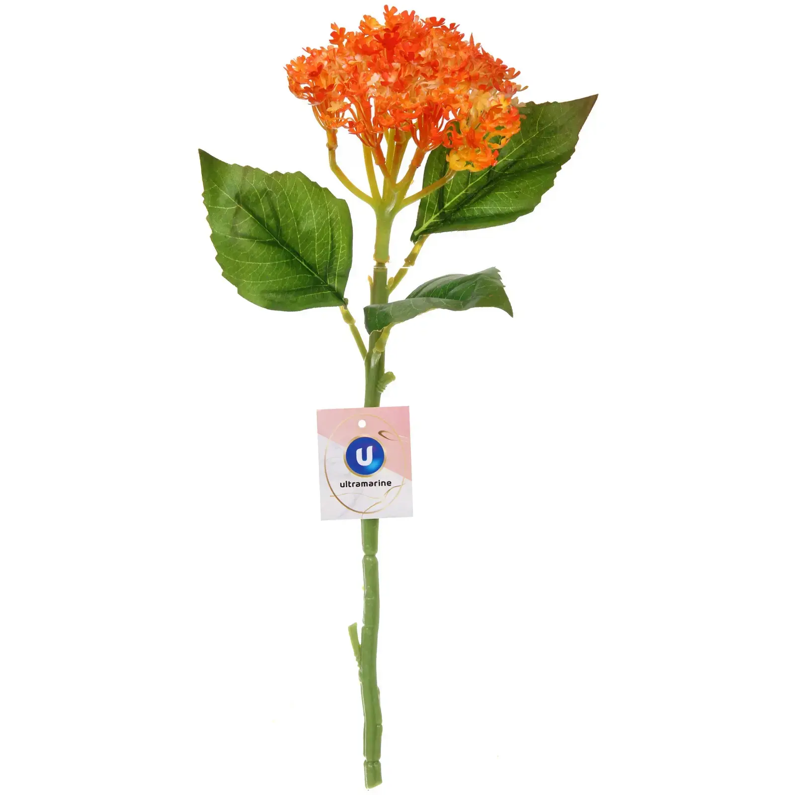 Цветок выполнен из высококачественных материалов: пластика и полиэстера, что обеспечивает его долговечность и устойчивость к внешним воздействиям. Яркие оранжевые соцветия и насыщенно зеленые листья с рельефной текстурой придают ему реалистичный вид. Размер цветка составляет 35 см, что делает его идеальным для настольного декора или создания композиций.