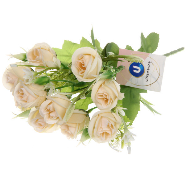Искусственные цветы идеально подходят для использования в различных интерьере: от домашнего декора до оформления мероприятий. Они могут стать прекрасным акцентом на столе, в вазе или в качестве элемента композиции. Букет состоит из нескольких раскрытых и бутонистых роз, а также зелёных листьев, что придаёт ему натуральный вид.