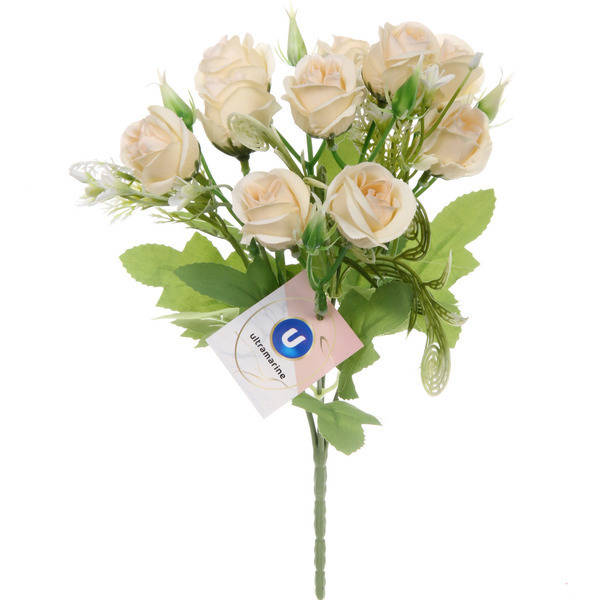 Цвет роз — светло-бежевый, что делает их универсальными для любого стиля интерьера. Материалы, из которых изготовлены цветы, включают пластик и полиэстер, что обеспечивает долговечность и устойчивость к внешним воздействиям. Стебли цветов обёрнуты зелёной лентой, что добавляет дополнительный шарм и натуральность.