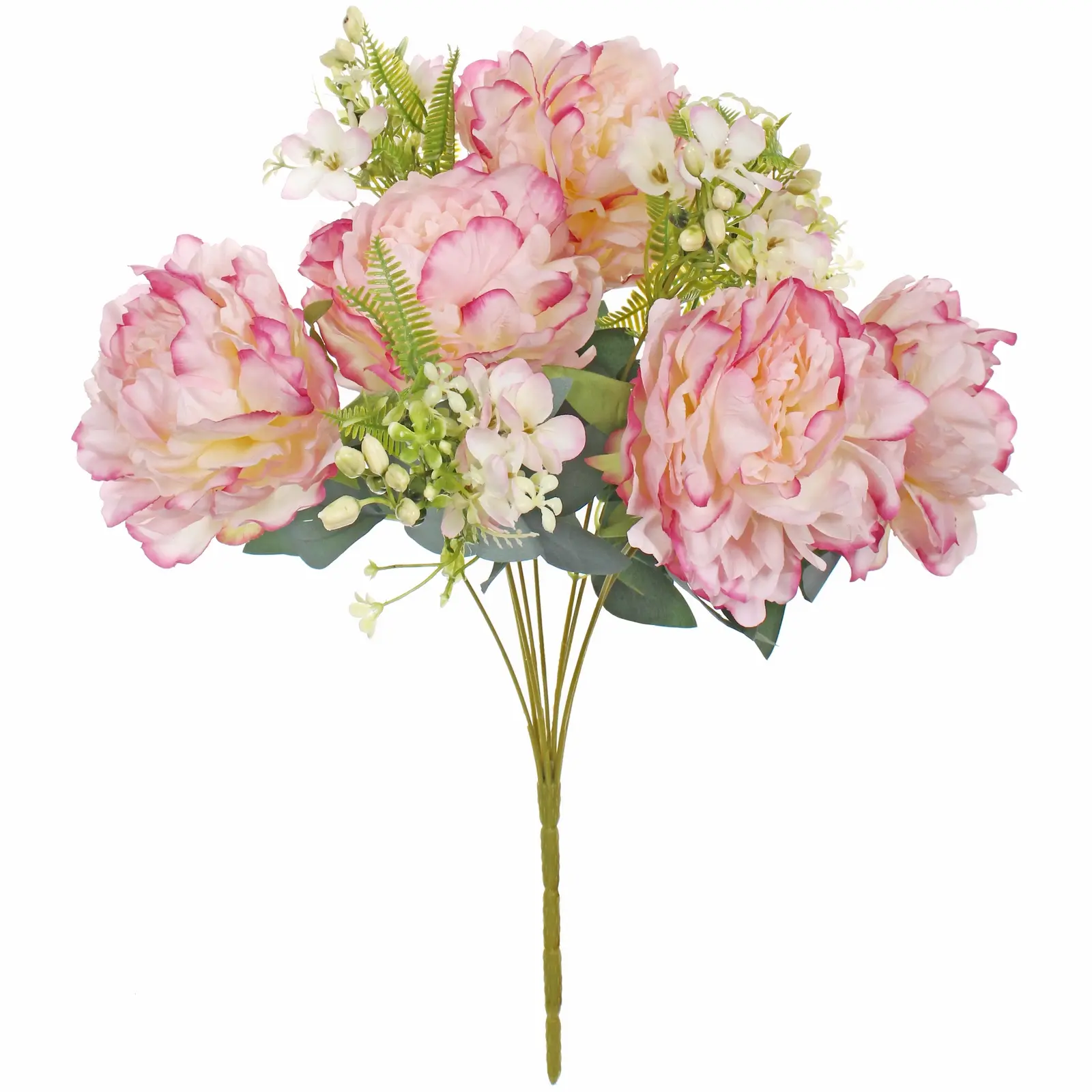 Высота композиции составляет 46 сантиметров, что позволяет гармонично вписать ее в интерьер от стола до подоконника. В каждом букете собрано пять крупных цветков с многослойными лепестками. Дополняет композицию зелень с вытянутыми листьями и мелкими элементами, имитирующими гипсофилу. Изготовлены из качественного пластика и полиэстера, обеспечивающих гибкость и устойчивость формы. Цветовая гамма – нежно-сиреневая, с плавными переходами от зелено-белого в центре к розовым краям. Это один товар в ассортименте, отгружается случайным образом по цветовым характеристикам.