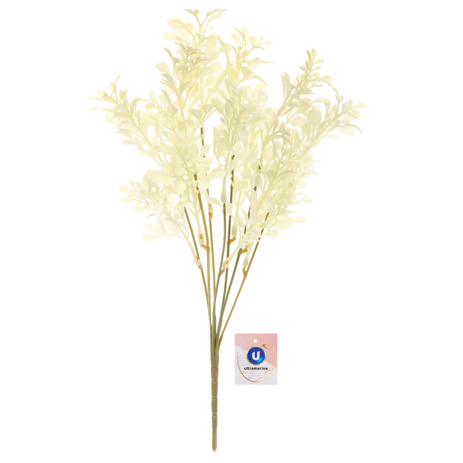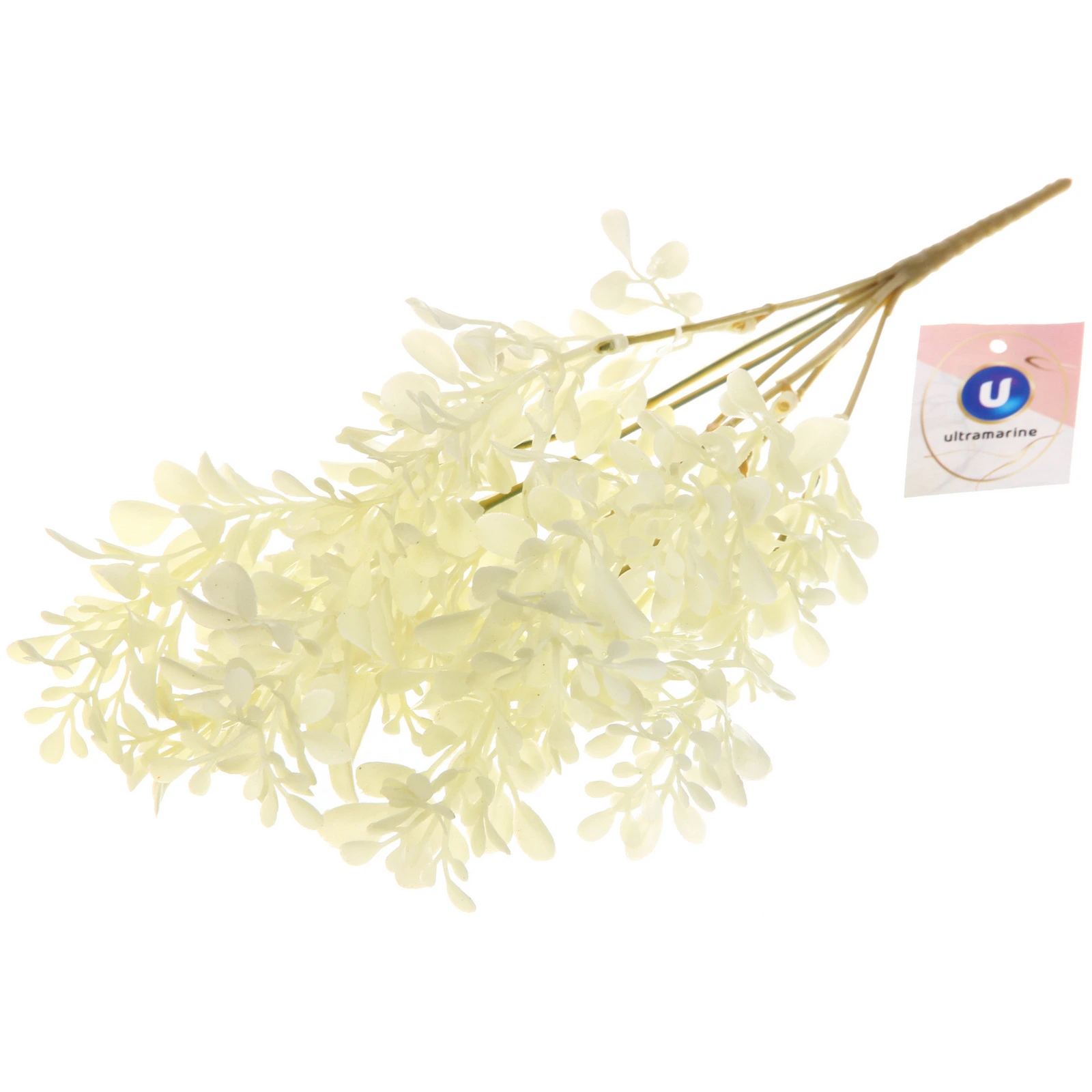 Ветка собрана в аккуратный пучок из нескольких стебельков, что упрощает её размещение. Общая высота композиции составляет около 40 см. Нежный кремово-белый цвет листвы в сочетании со светло-зелёными/бежевыми стеблями делает её нейтральным элементом, который гармонично впишется в скандинавский, прованс, классический или современный стиль интерьера. Она идеально подходит для украшения гостиной, спальни, ванной комнаты, обеденного стола, офисного кабинета или витрины магазина.
