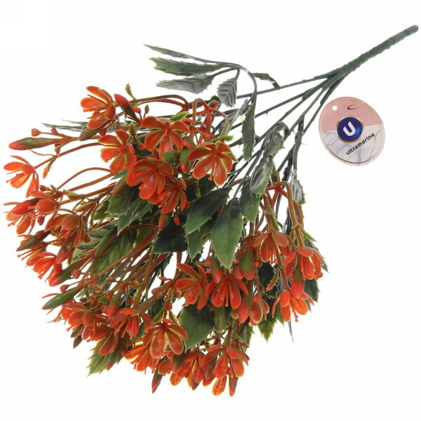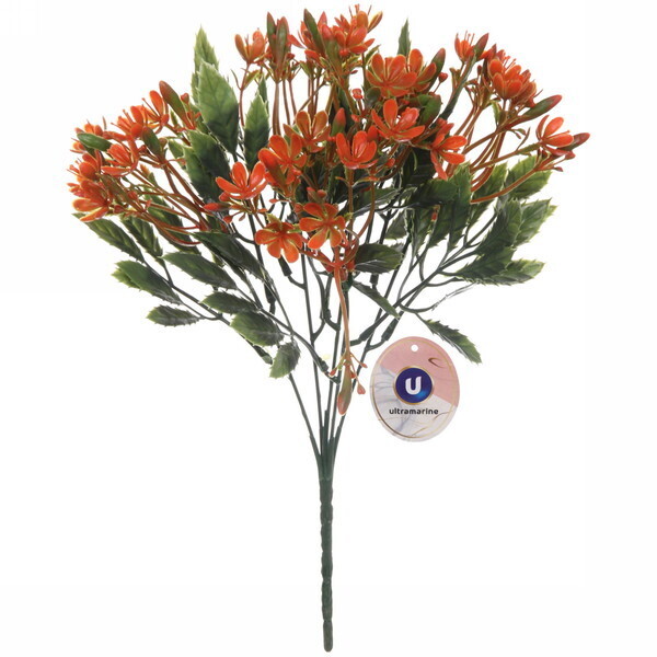 Цветы выполнены из качественного пластика, что обеспечивает их долговечность и устойчивость к внешним воздействиям. Оранжевые цветы имеют реалистичный вид, а зеленые листья добавляют натуральности. Высота букета составляет 30 см, что делает его идеальным для размещения на столах, полках или в вазах.