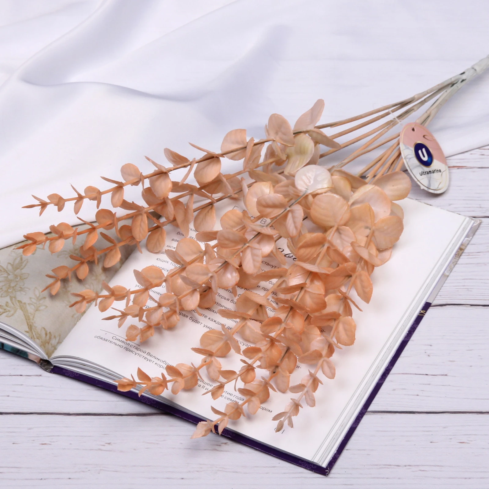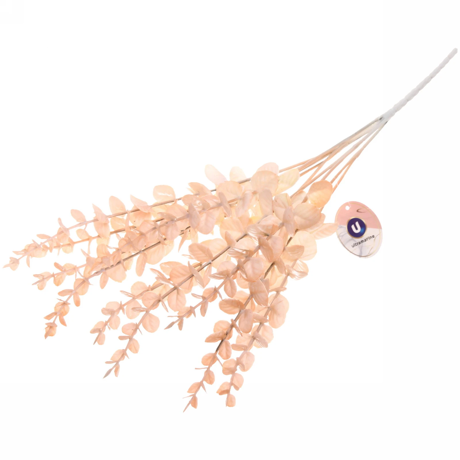 Общая высота ветки составляет 53 см. Она состоит из нескольких стеблей, расходящихся веером, что создаёт объём. Листья мелкие, округлой и овальной формы, закреплены прочно. Основание стеблей аккуратно собрано. В комплекте присутствует фирменный круглый ярлык бренда.
