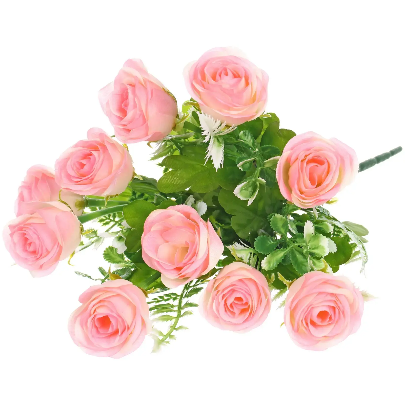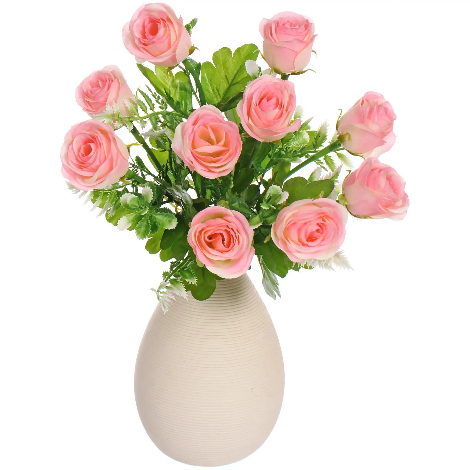 Каждый цветок в букете тщательно выполнен, с аккуратно свернутыми лепестками, создающими объемную и реалистичную структуру. Листья и стебли насыщенного зеленого цвета, с характерной текстурой и зазубренными краями, добавляют композиции естественности. Этот букет станет прекрасным дополнением к вашему интерьеру, привнеся в него нотку изысканности и утонченности.