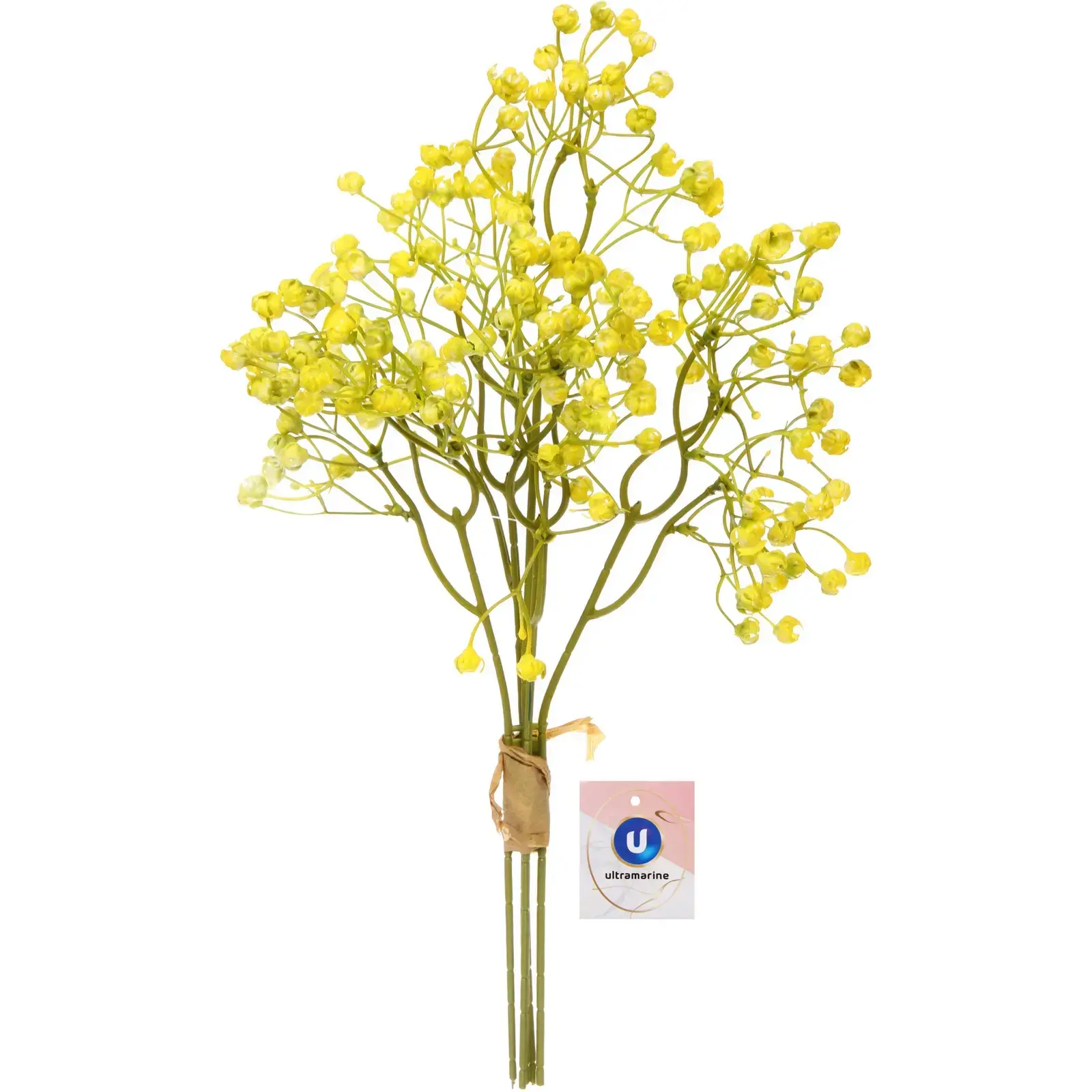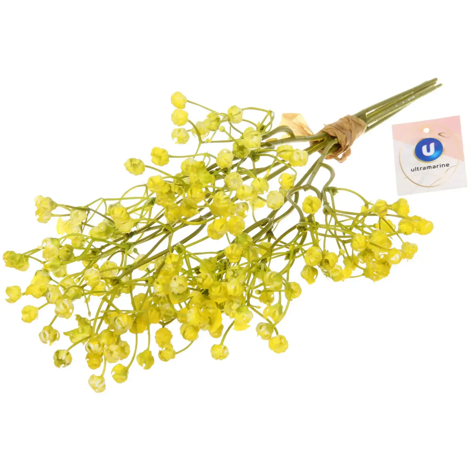 Букет состоит из множества мелких желтых бутонов, собранных на тонких зеленых стеблях. Он связан в нижней части тонкой лентой, что придает ему аккуратный вид. Размер букета составляет 38 см, что делает его идеальным для размещения на столах или полках. Изготовлен из высококачественного пластика, что обеспечивает его долговечность и устойчивость к внешним воздействиям.