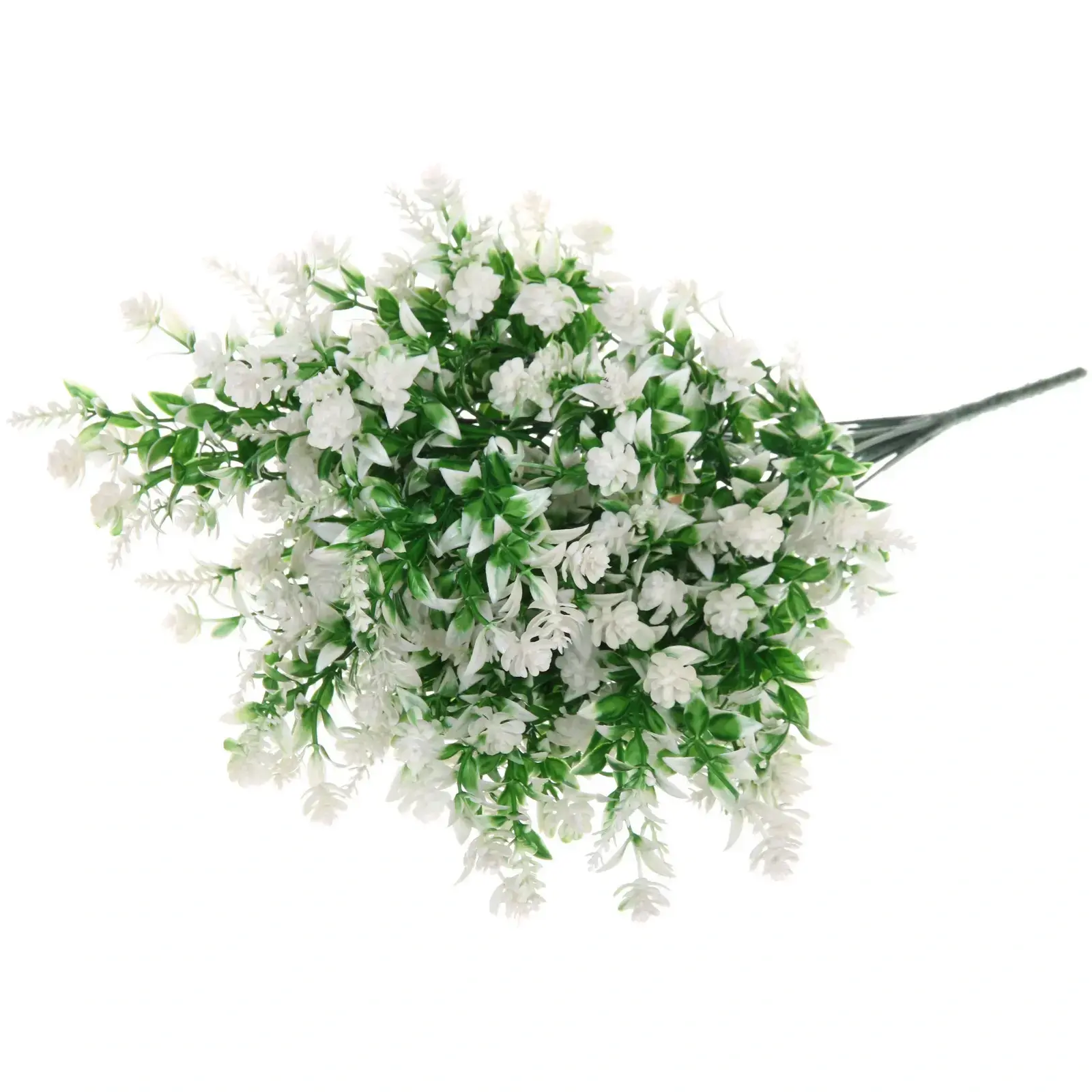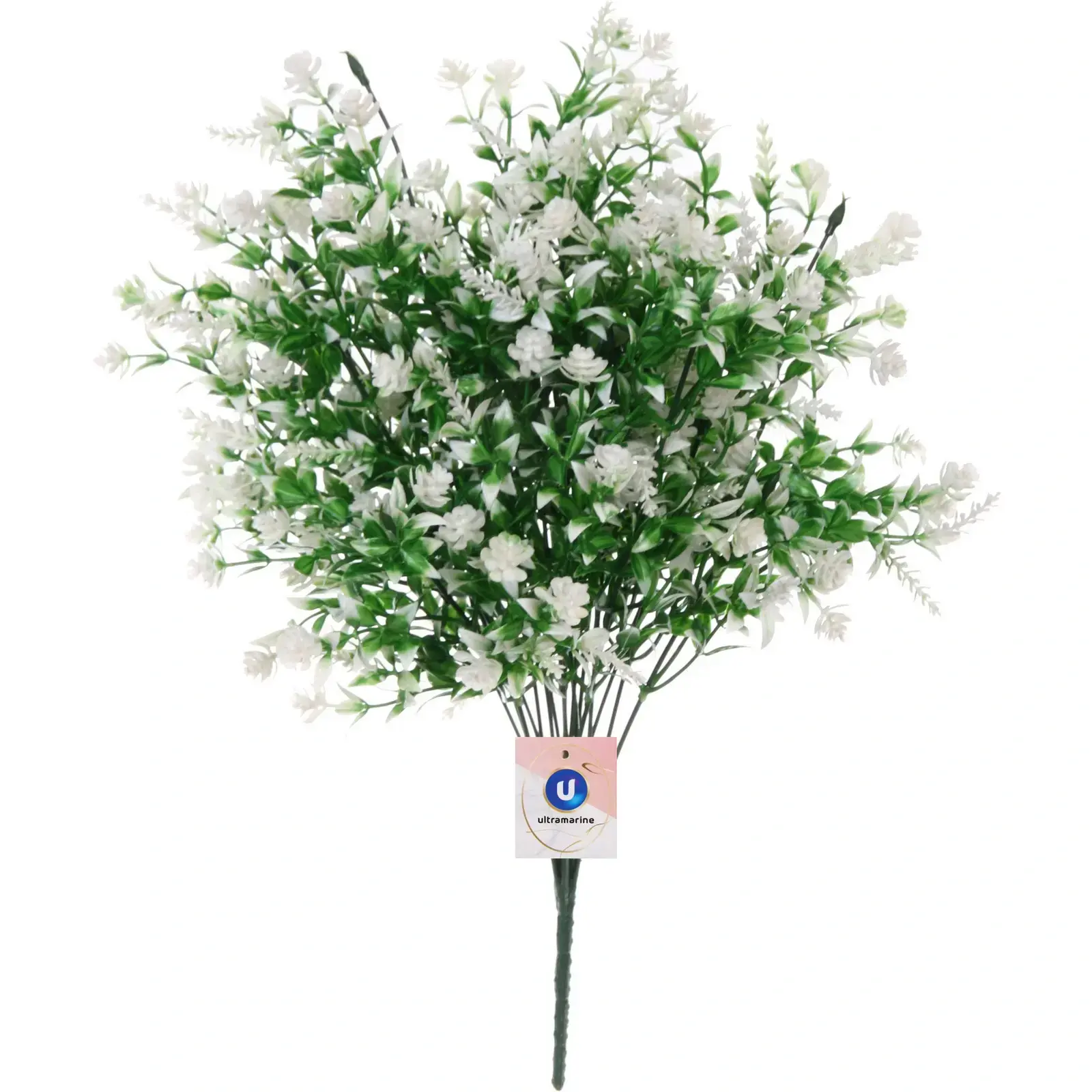Букет выполнен из высококачественного пластика, что обеспечивает его долговечность и устойчивость к внешним условиям. Размер букета составляет 52 см, что делает его идеальным для размещения на столах, полках или в вазах. Белые цветы с зелеными листьями создают эффект природности и свежести, что делает этот букет отличным выбором для любого интерьера.