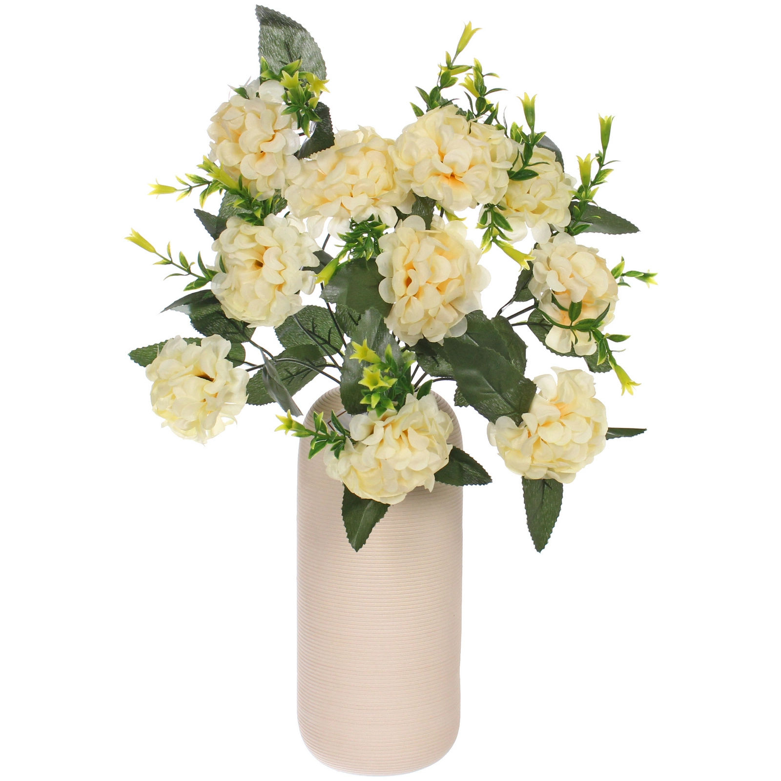 Букет искусно воссоздаёт естественную прелесть садовых гортензий. Каждое соцветие собрано из множества мелких лепестков кремово-персикового оттенка, которые образуют пышные шары. Тонкие зелёные бутоны и листья с чёткой фактурой прожилок добавляют композиции натуралистичности. Лепестки из полиэстера имеют мягкую текстуру и лёгкий блеск, а стебли и листья из пластика выглядят очень естественно.