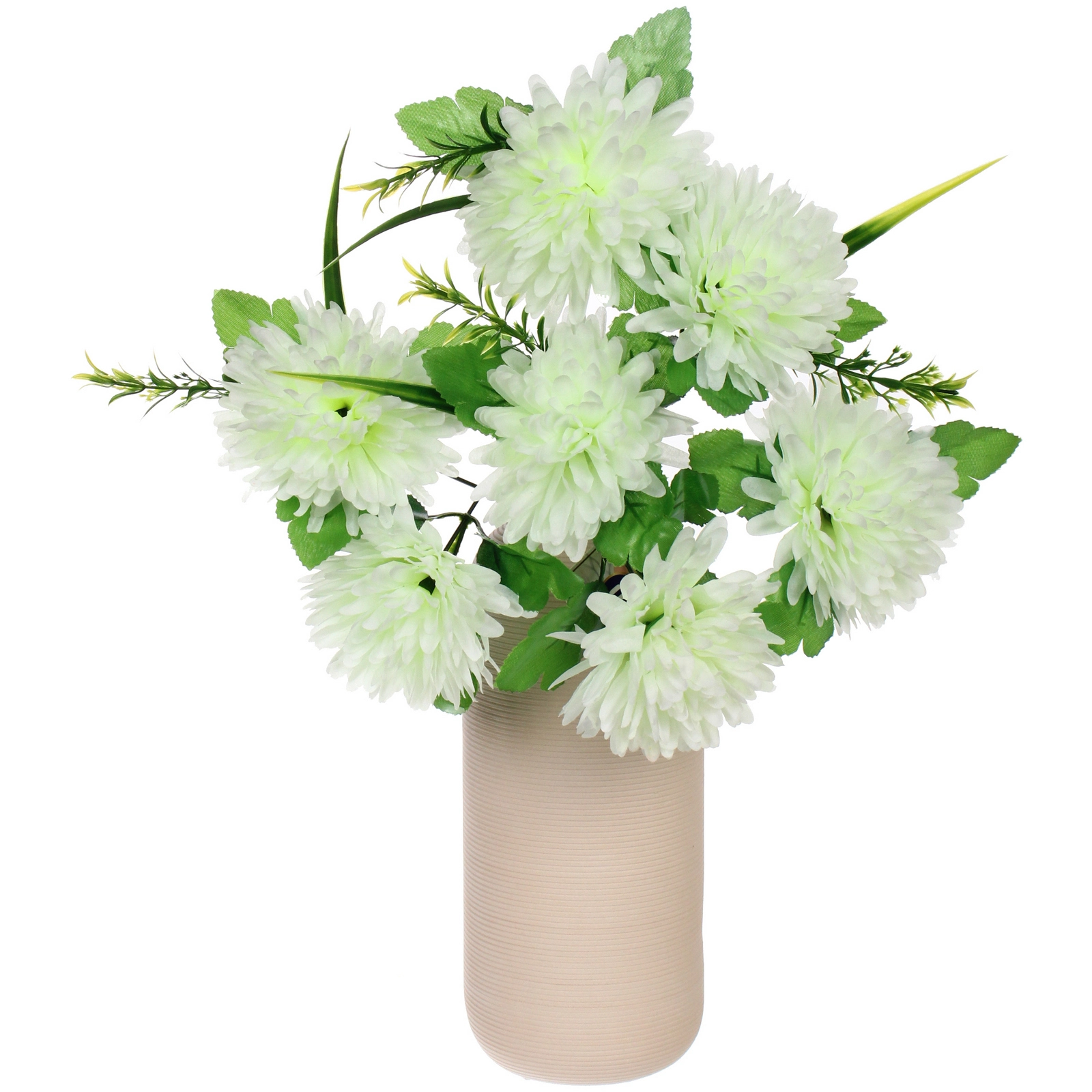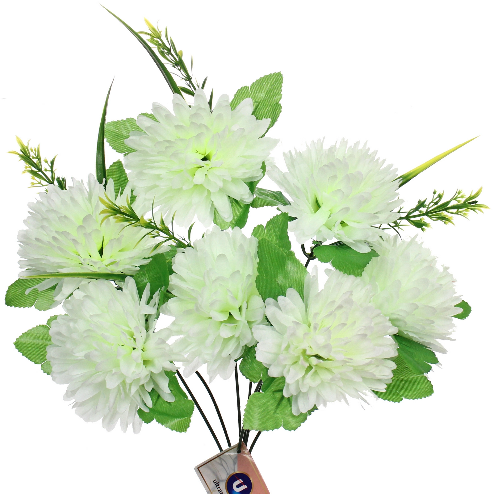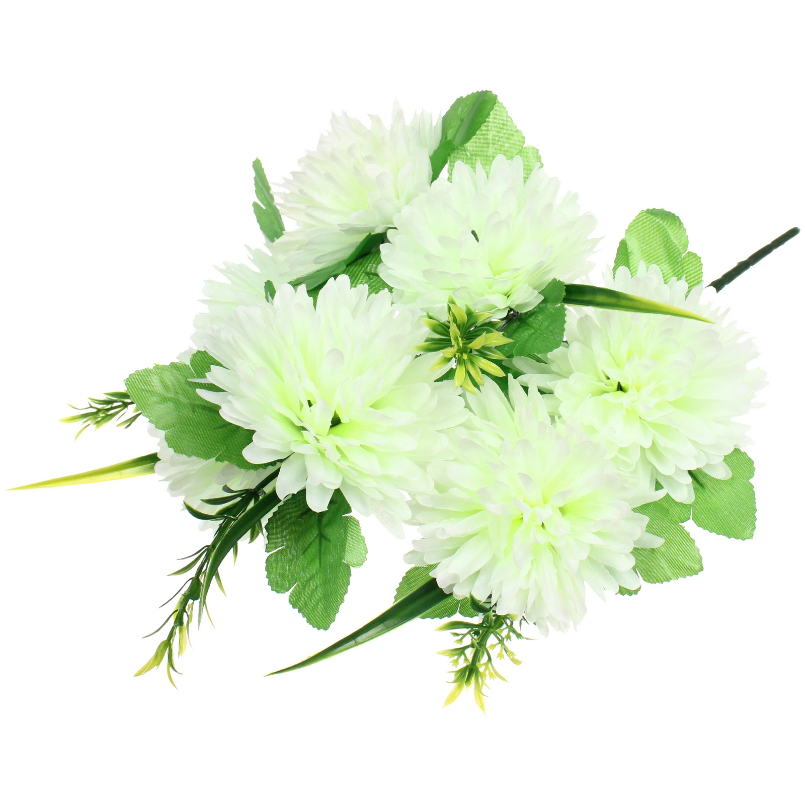 Букет состоит из 7 крупных, пышных соцветий шарообразной формы, собранных из множества узких лепестков. Высота композиции составляет 40 см. В ассортименте представлены нежные бело-зелёные оттенки, которые гармонично впишутся как в классический, так и в современный интерьер. Композиция дополнена искусной зеленью: крупными листьями с фактурными прожилками и тонкими декоративными побегами, что добавляет натуралистичности. Стебли собраны в единое основание для удобства размещения.