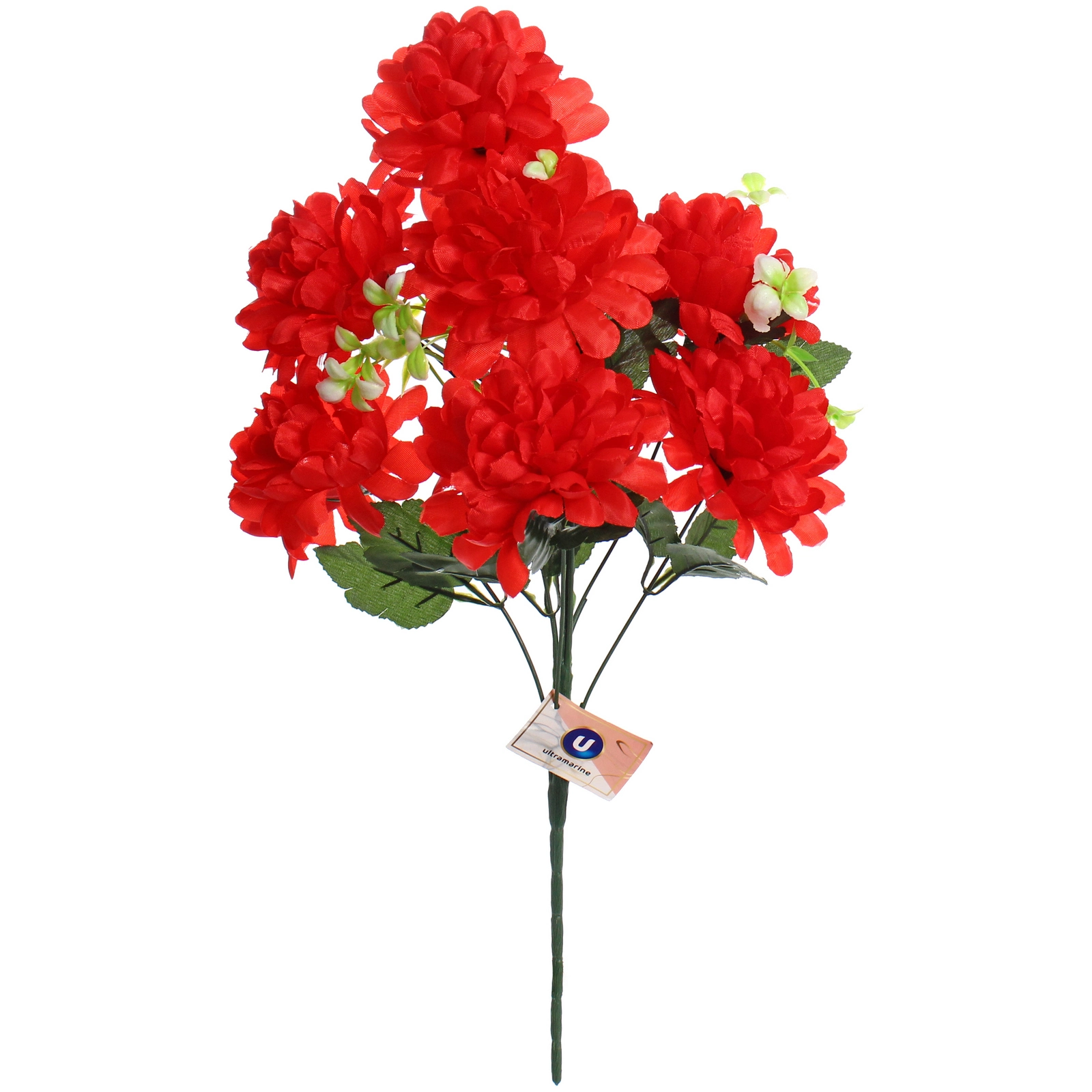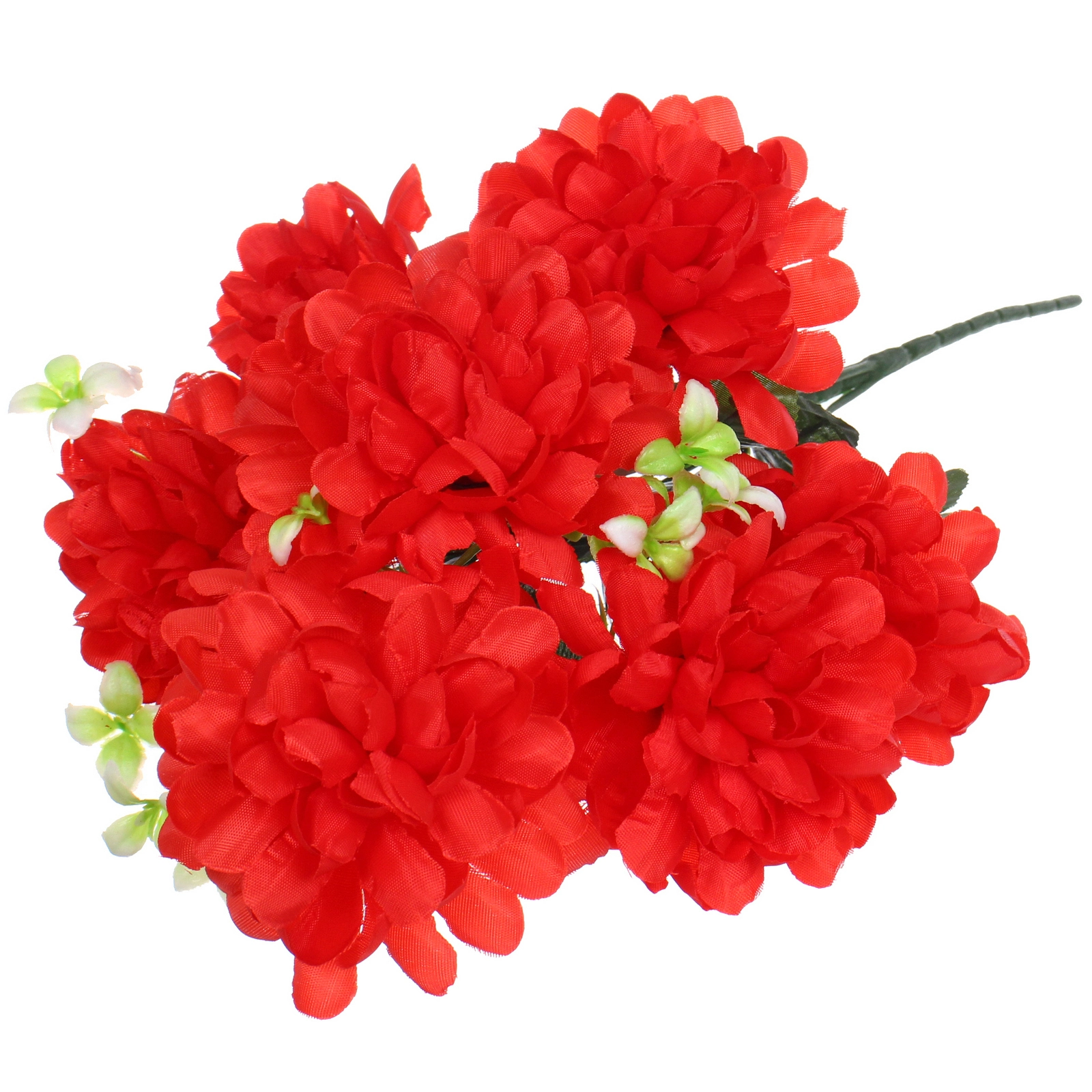 Букет искусно воссоздаёт очарование живых хризантем. Каждый из семи крупных цветков имеет многослойные, тщательно проработанные лепестки с гладкой фактурой и насыщенным красным оттенком. Композицию дополняют мелкие декоративные элементы — бутоны и цветки в нежных бело-зелёных тонах, а также зелёные листья с чёткими прожилками. Стебли, собранные в единый пучок, имитируют натуральные, что делает букет неотличимым от настоящего на расстоянии.