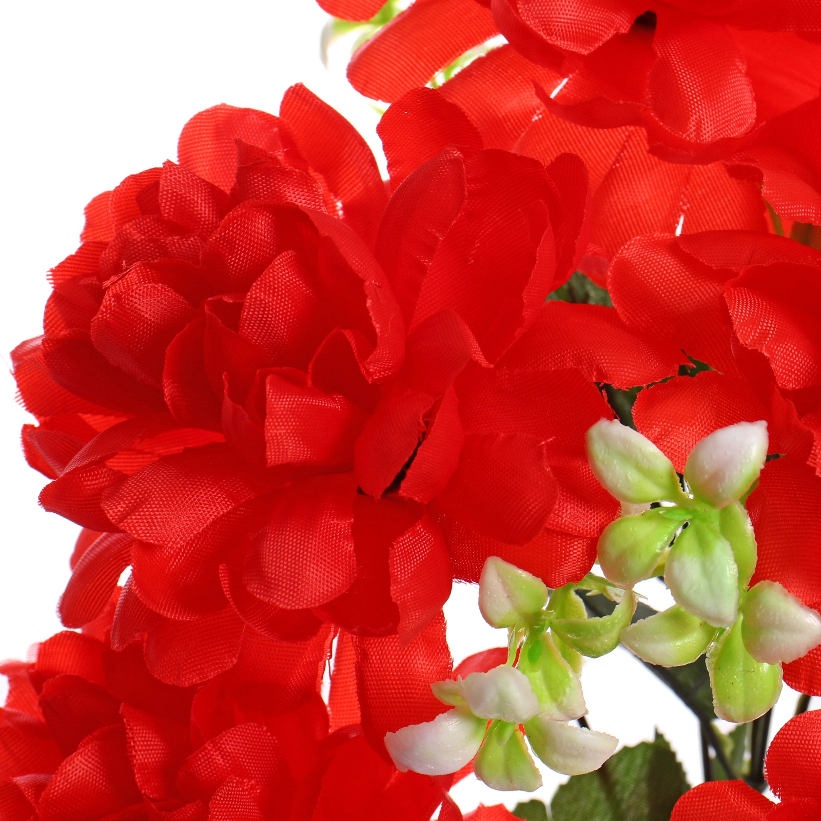Букет состоит из 7 основных соцветий ярко-красного цвета, дополненных декоративными элементами. Общая высота композиции составляет 49 см. Материалы изготовления — пластик и полиэстер, которые обеспечивают прочность и сохранение формы. Благодаря качественным материалам, букет устойчив к выцветанию и легко очищается от пыли.