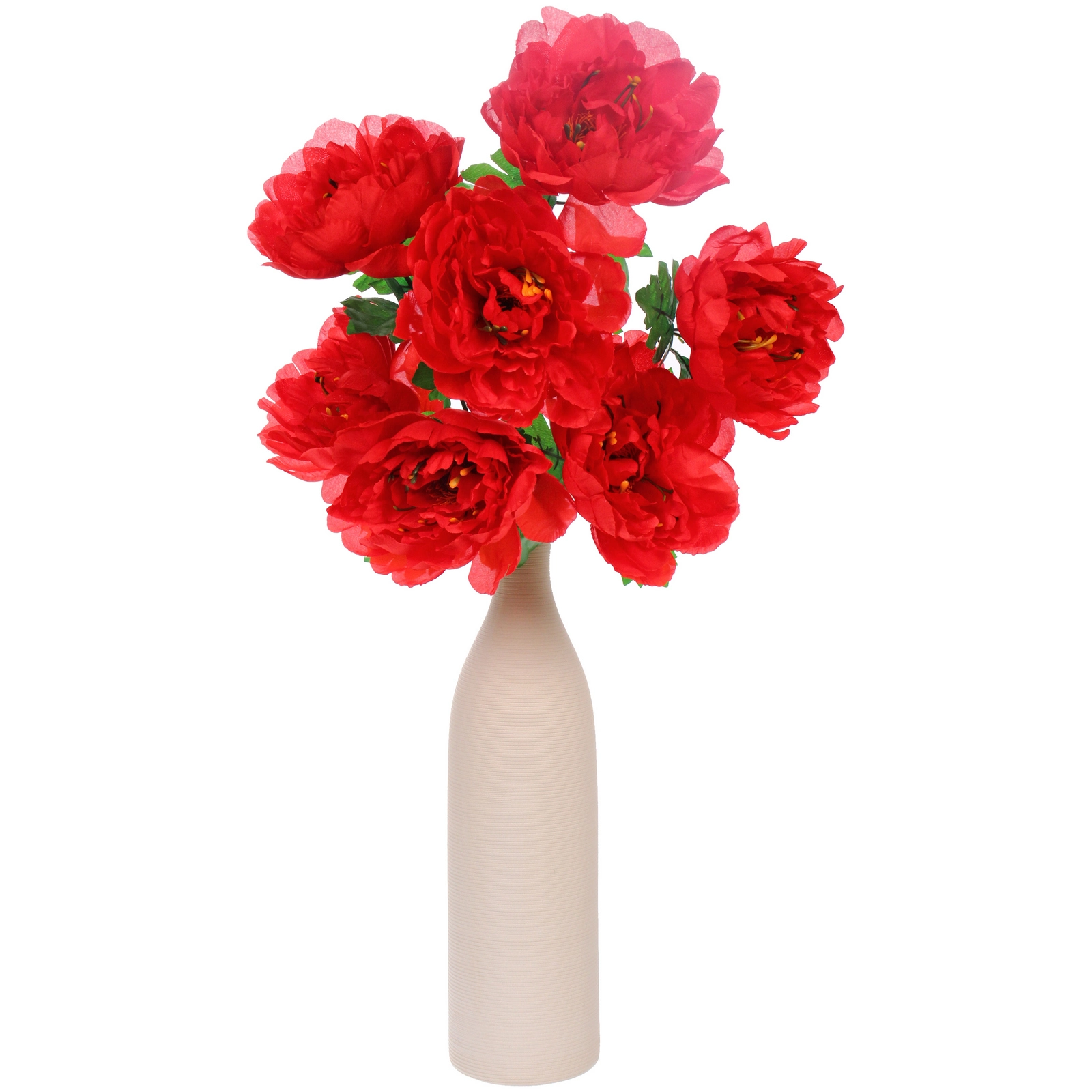 Наслаждайтесь красотой цветущего сада круглый год! Этот искусственный букет из семи ярко-красных пионов станет идеальным украшением для вашей гостиной, спальни, кухни или офиса. Он не требует полива, не вянет и всегда выглядит свежо и нарядно, создавая уютную и жизнерадостную атмосферу.