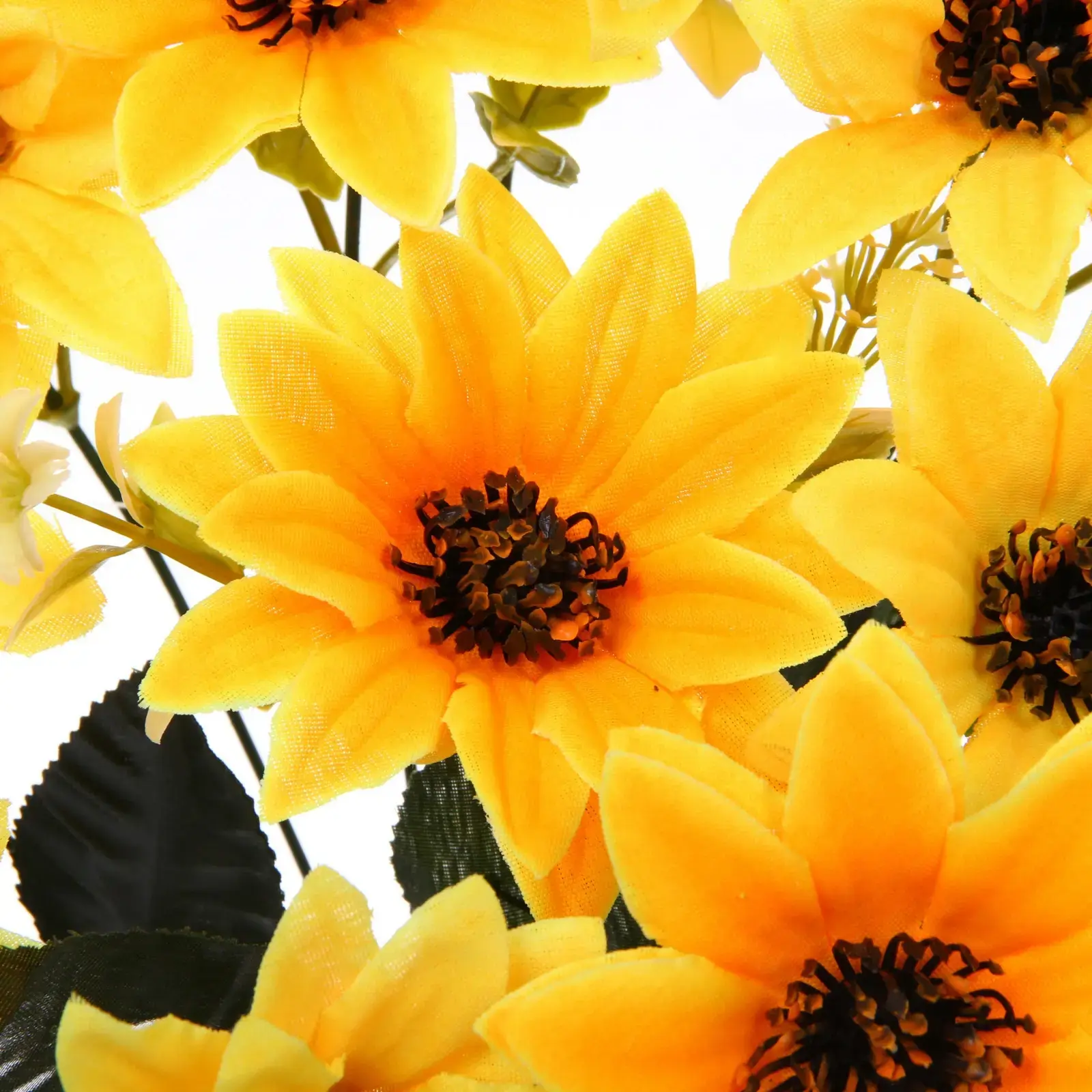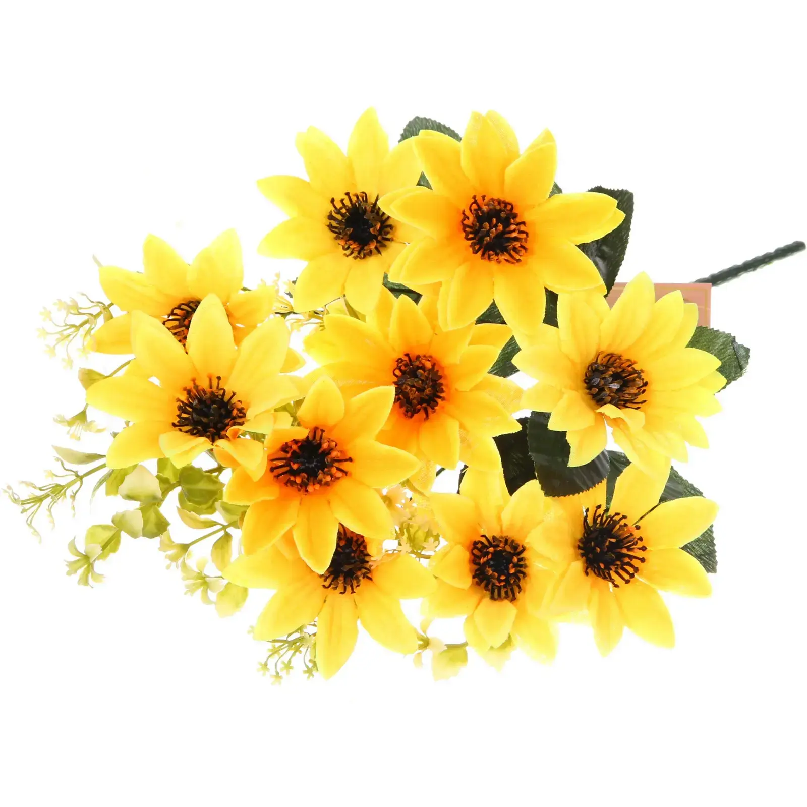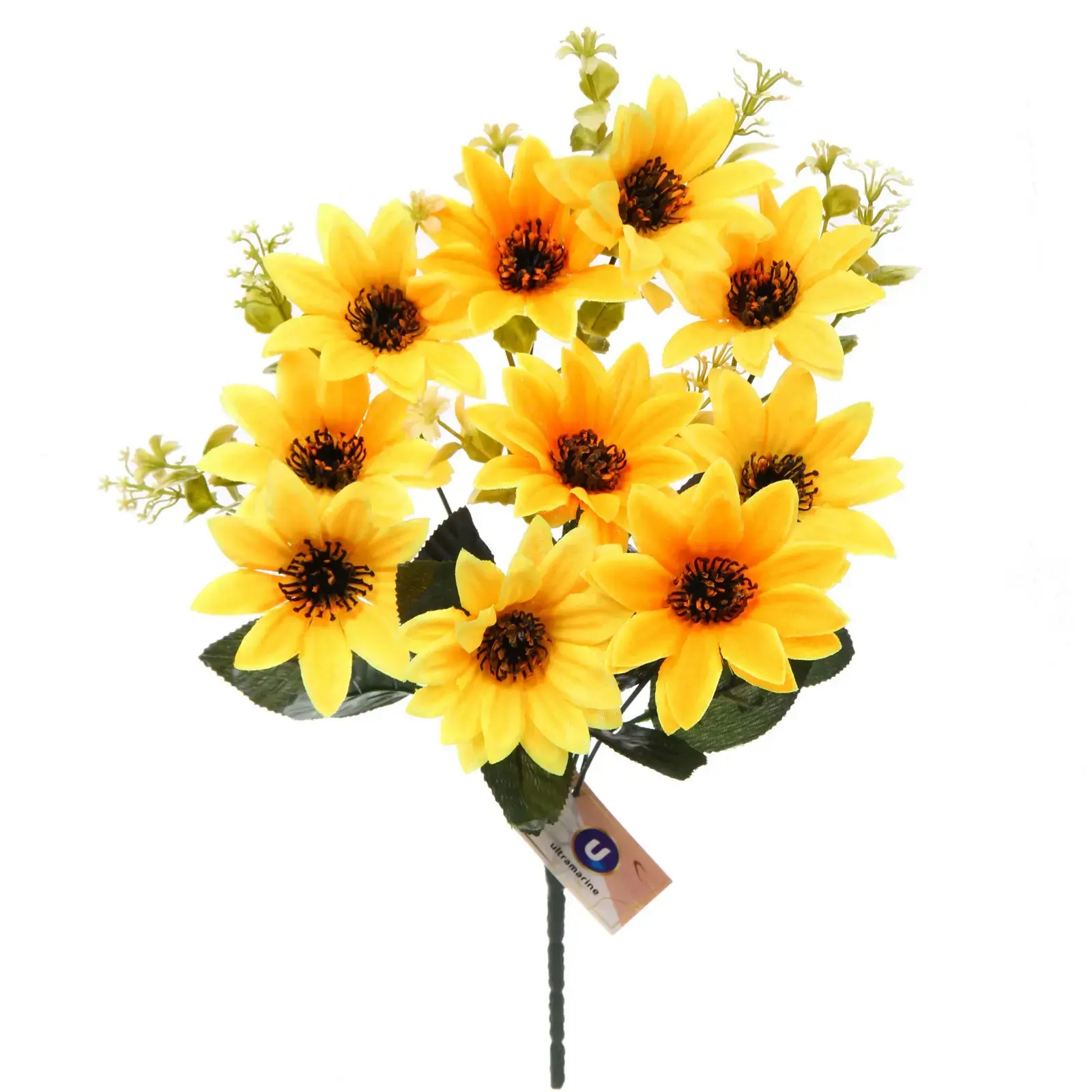 Каждый букет состоит из 10 ярко-желтых цветков с коричневыми центрами, высота составляет 40 см. Листья и стебли выполнены из качественного пластика, что обеспечивает их долговечность и устойчивость к повреждениям. Эти цветы станут отличным дополнением к вашему интерьеру, добавляя яркие акценты и создавая атмосферу уюта.
