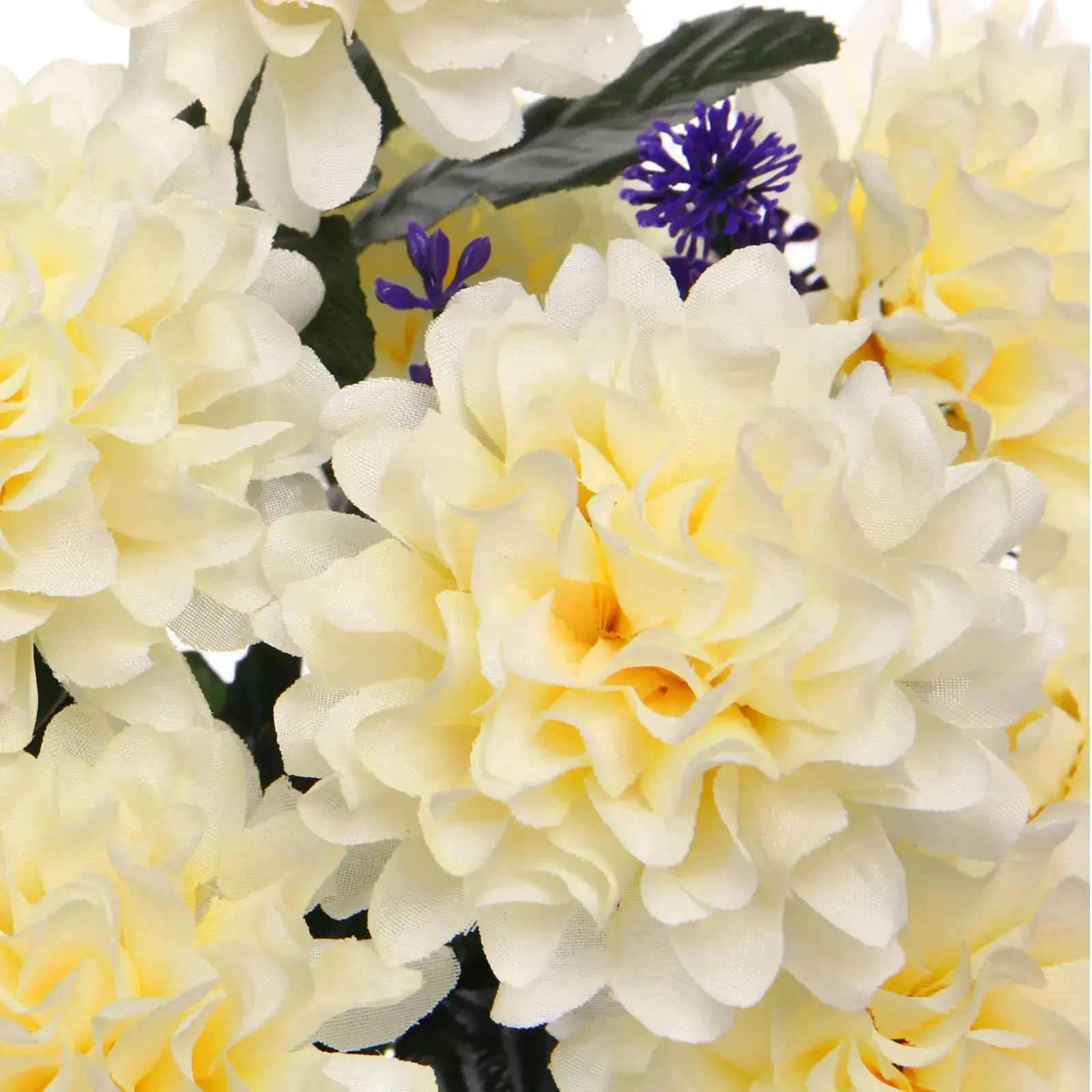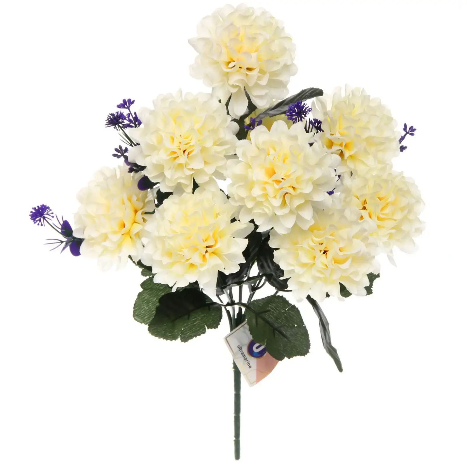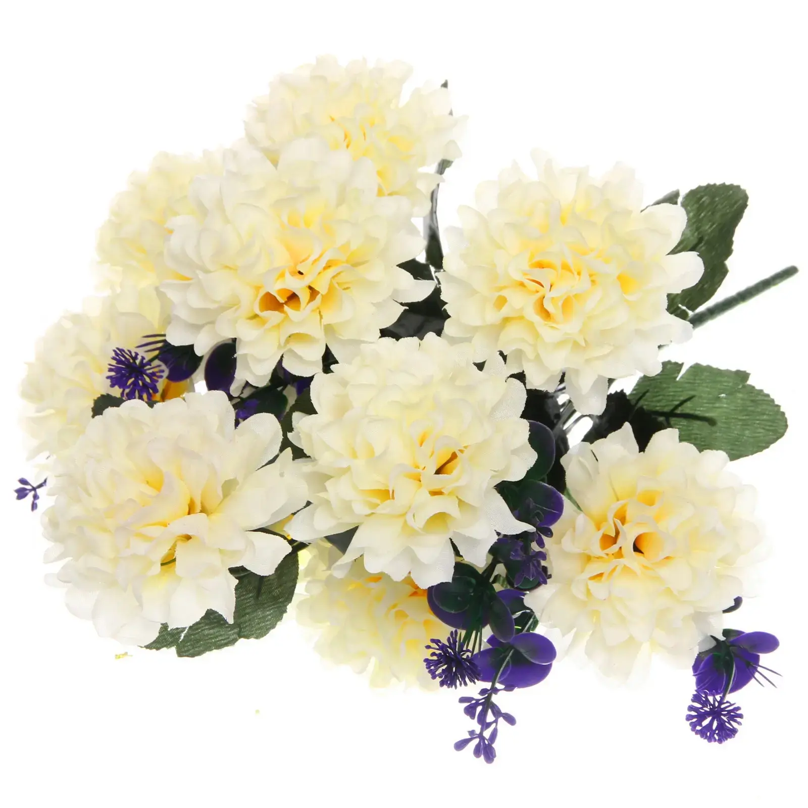 Букет состоит из 10 цветков, выполненных из качественного пластика и полиэстера, что обеспечивает их долговечность и устойчивость к внешним воздействиям. Размер букета составляет 42 см, что делает его идеальным для размещения на столах, полках или в вазах. Цветы имеют светло-желтый оттенок с фиолетовыми акцентами, что добавляет яркости и свежести в любой интерьер.