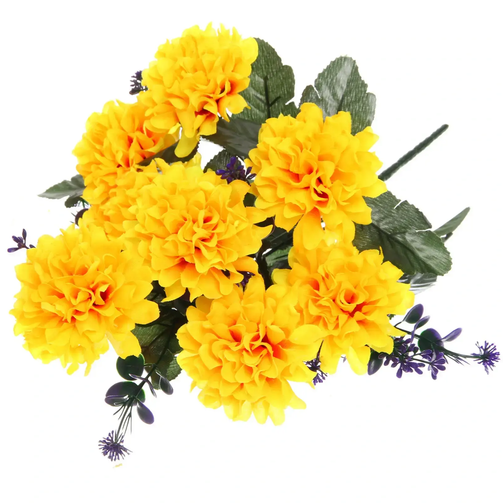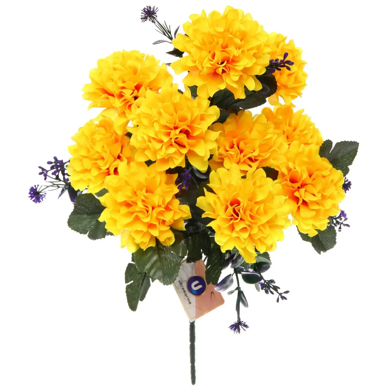 Букет состоит из 10 крупных желтых цветов, напоминающих хризантемы, дополненных нежными фиолетовыми акцентами. Высота композиции составляет 42 см, что делает ее идеальной для декора любых помещений.