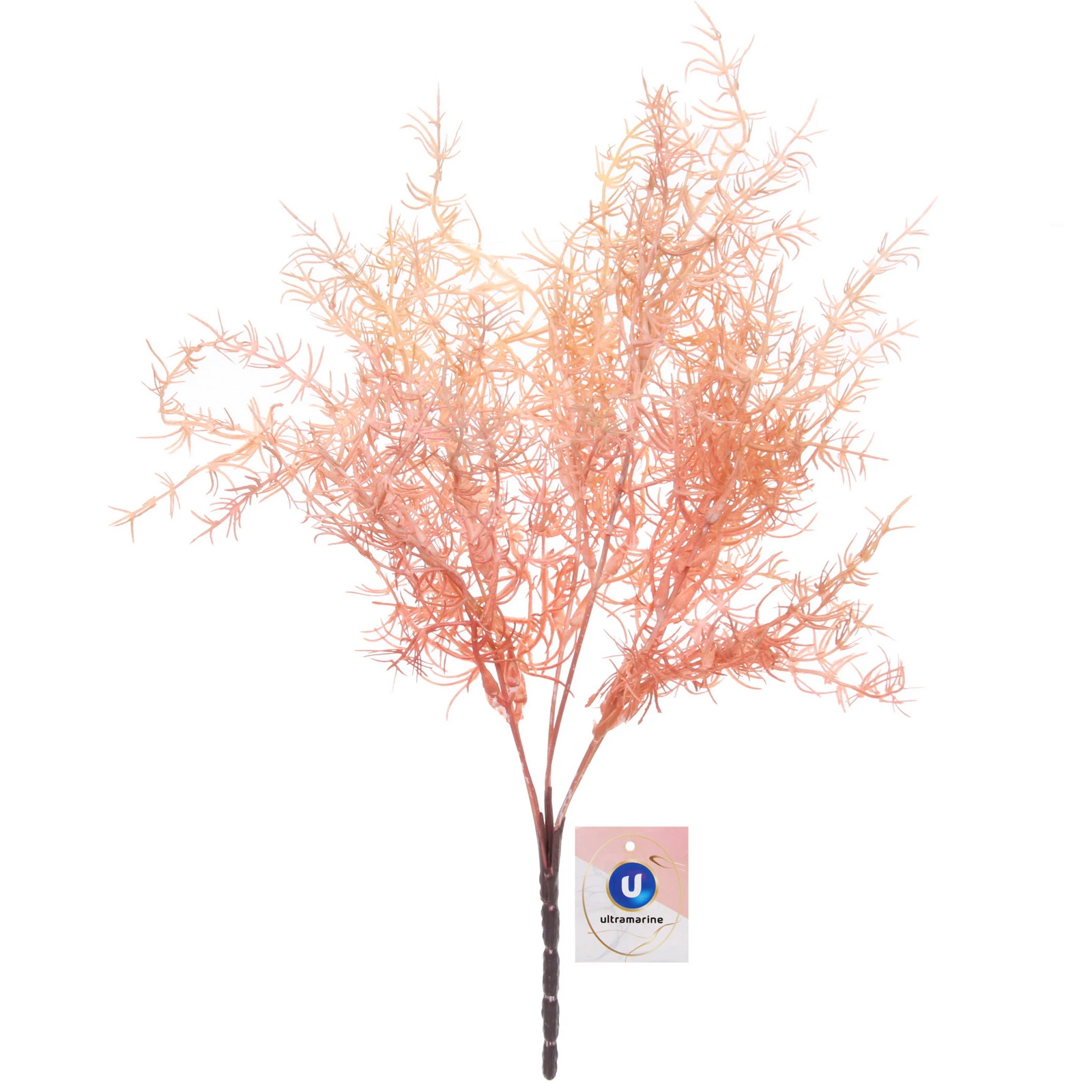 Ветка имеет общую высоту 38 см. Она состоит из прочного тёмного основного стебля, от которого отходят многочисленные тонкие и гибкие ответвления, образующие пышную, объёмную крону. Мелкие листья-иголочки густо покрывают побеги, создавая эффект лёгкой, воздушной травы. Нежный розовый цвет с мягкими переходами оттенков добавляет композиции изысканности и визуальной глубины. Изготовлена из качественного пластика, обеспечивающего долговечность и стойкость цвета.