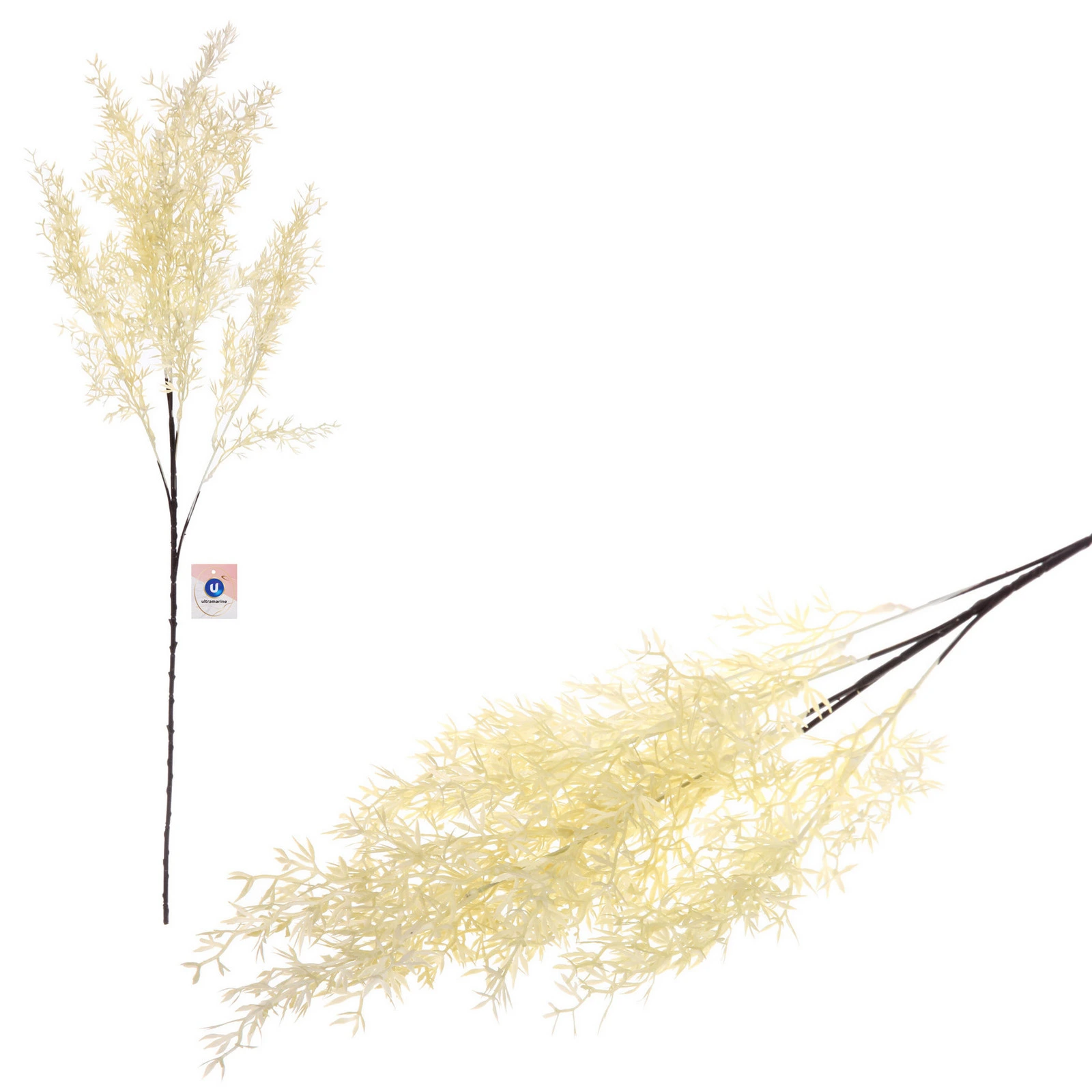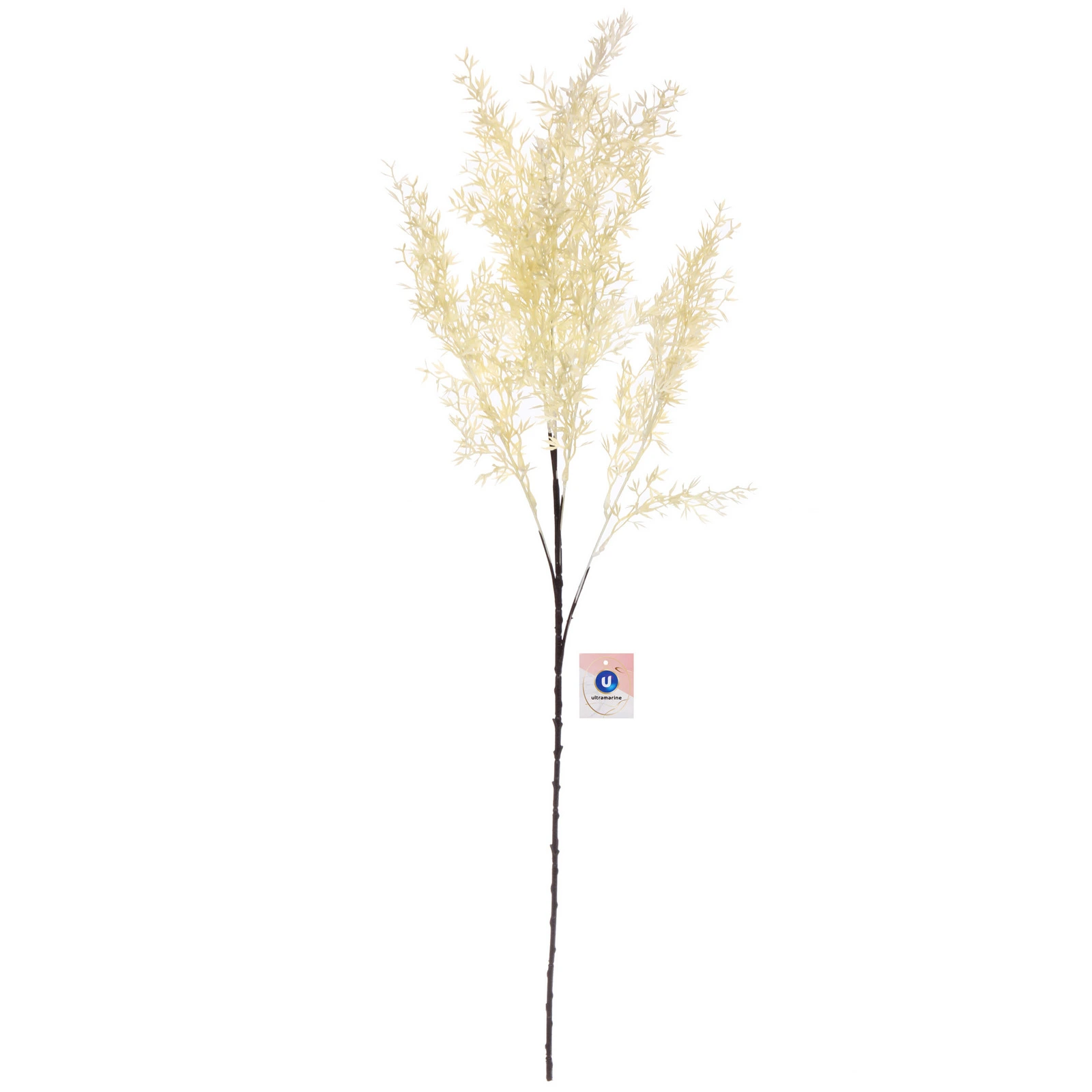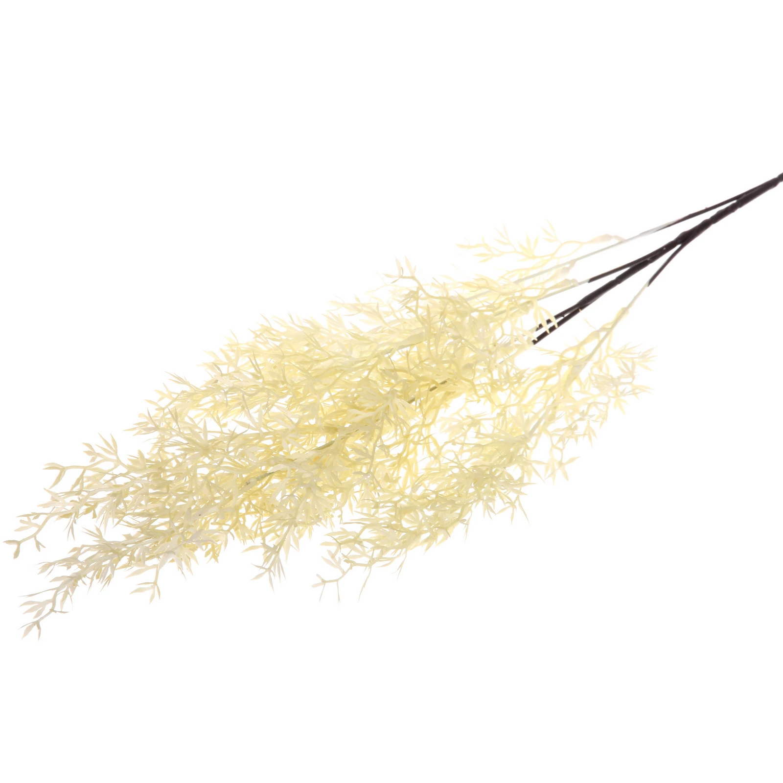 Ветка имеет общую высоту около 80 сантиметров, что делает её заметным и самодостаточным элементом декора. Она состоит из нескольких основных тёмно-коричневых стеблей, которые разветвляются на множество тонких гибких побегов светлого оттенка. Листья мелкие, узкие и густо расположенные, создающие эффект пышной, воздушной кроны. Материал изготовления — качественный пластик, приятный на вид и безопасный в использовании. Цвет листвы — нежный белый с кремовым или светло-жёлтым подтоном, стебли — тёмные. Такая палитра легко впишется в интерьер любой цветовой гаммы: от классической белой и скандинавской до более тёмной или яркой.