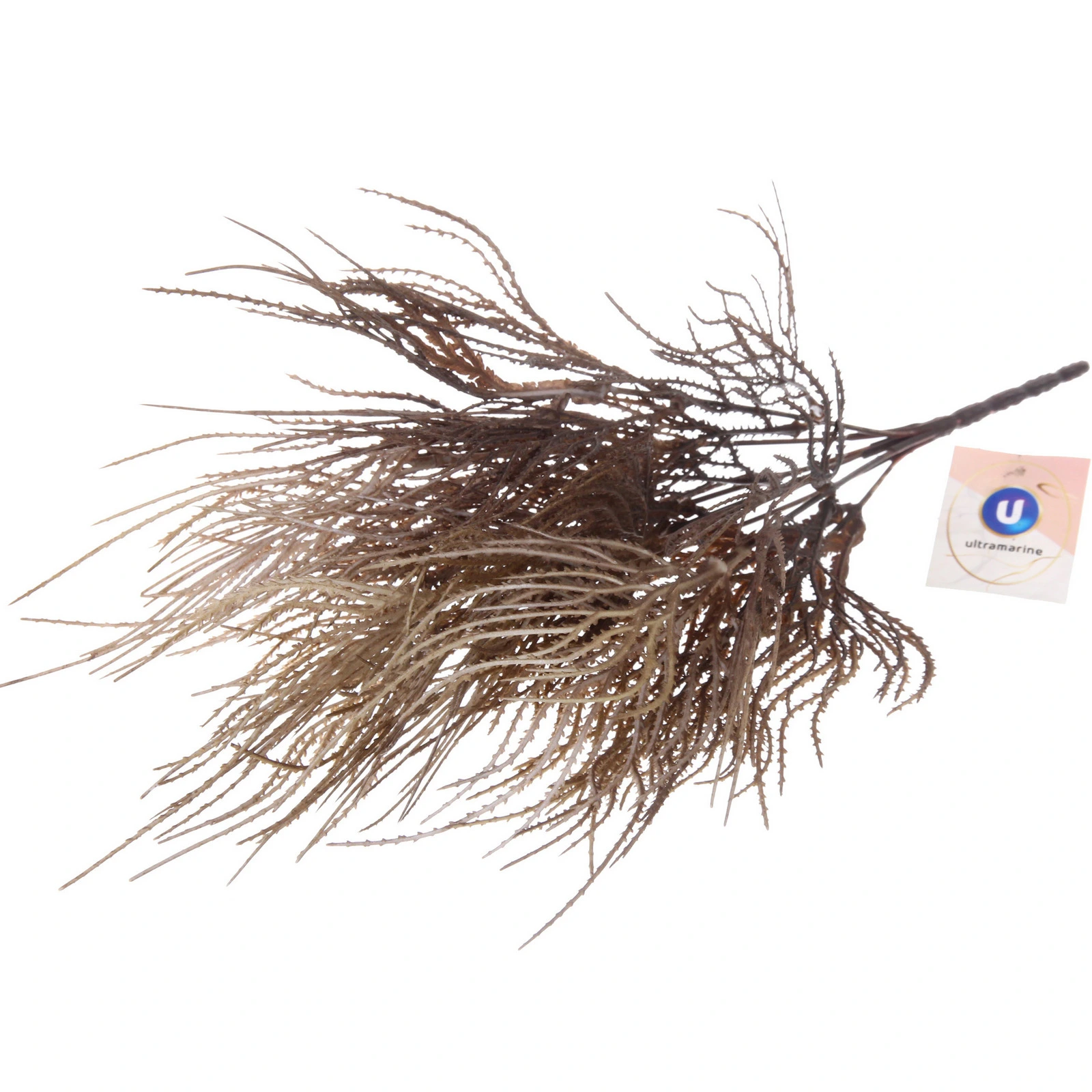 Эта декоративная композиция выполнена с невероятным вниманием к деталям. Множество тонких, разветвлённых стеблей создают объём и естественную, раскидистую форму. Градиентная окраска от тёмно-коричневого у основания до светлого бежевого на кончиках придаёт ветке реалистичность и визуальную глубину, делая её похожей на натуральное растение.
