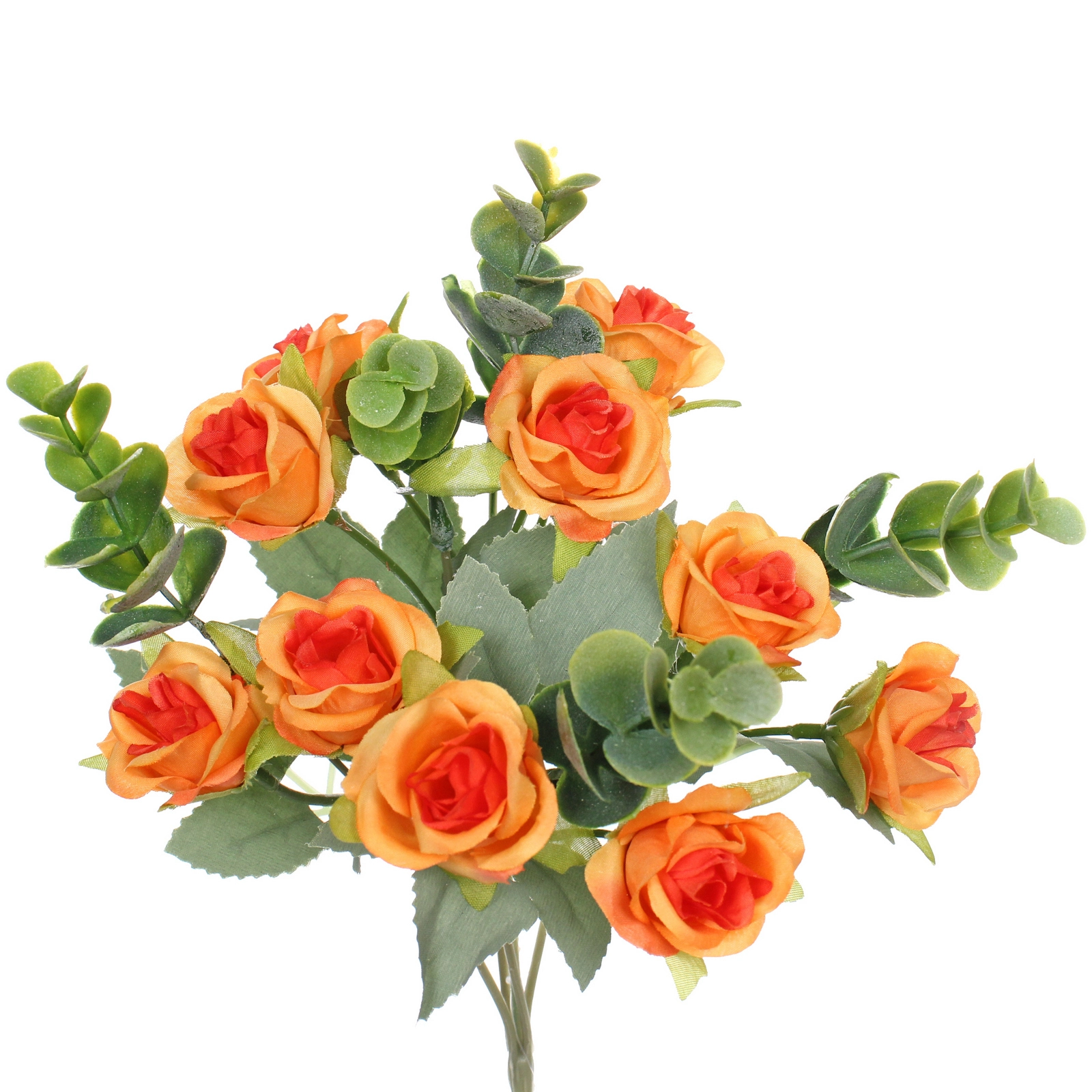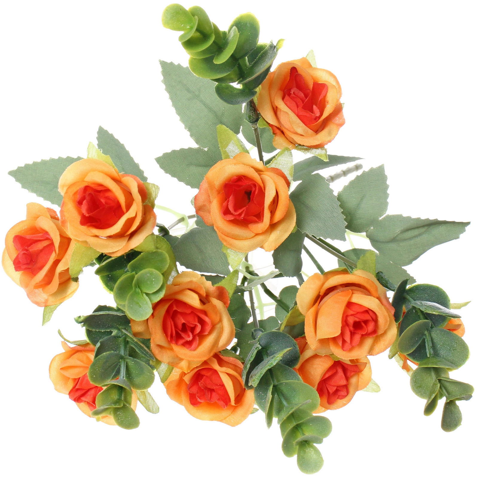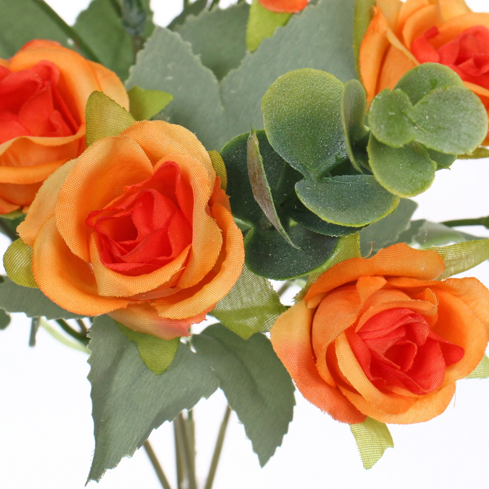 Общая высота композиции составляет примерно 30 см. Каждый цветок закреплён на тонком зелёном стебле. Лепестки выполнены из текстильного материала, имитирующего натуральную ткань, а листья и декоративные элементы — из пластика. Разноцветный принт: вы получите один букет в оттенках оранжевой гаммы, точный тон может незначительно отличаться от изображения на фото из-за настроек монитора. В нижней части стеблей может присутствовать фирменный ярлык производителя.