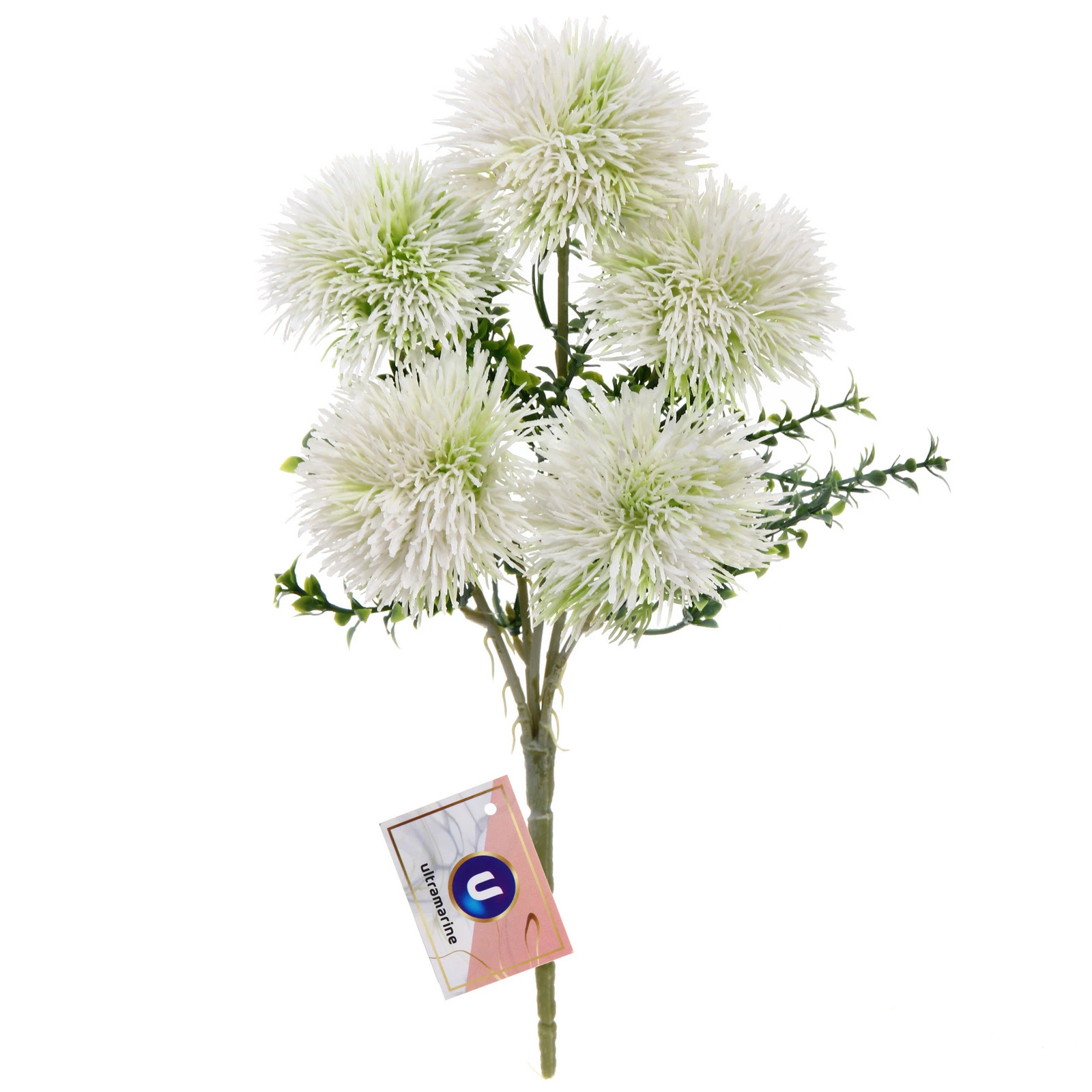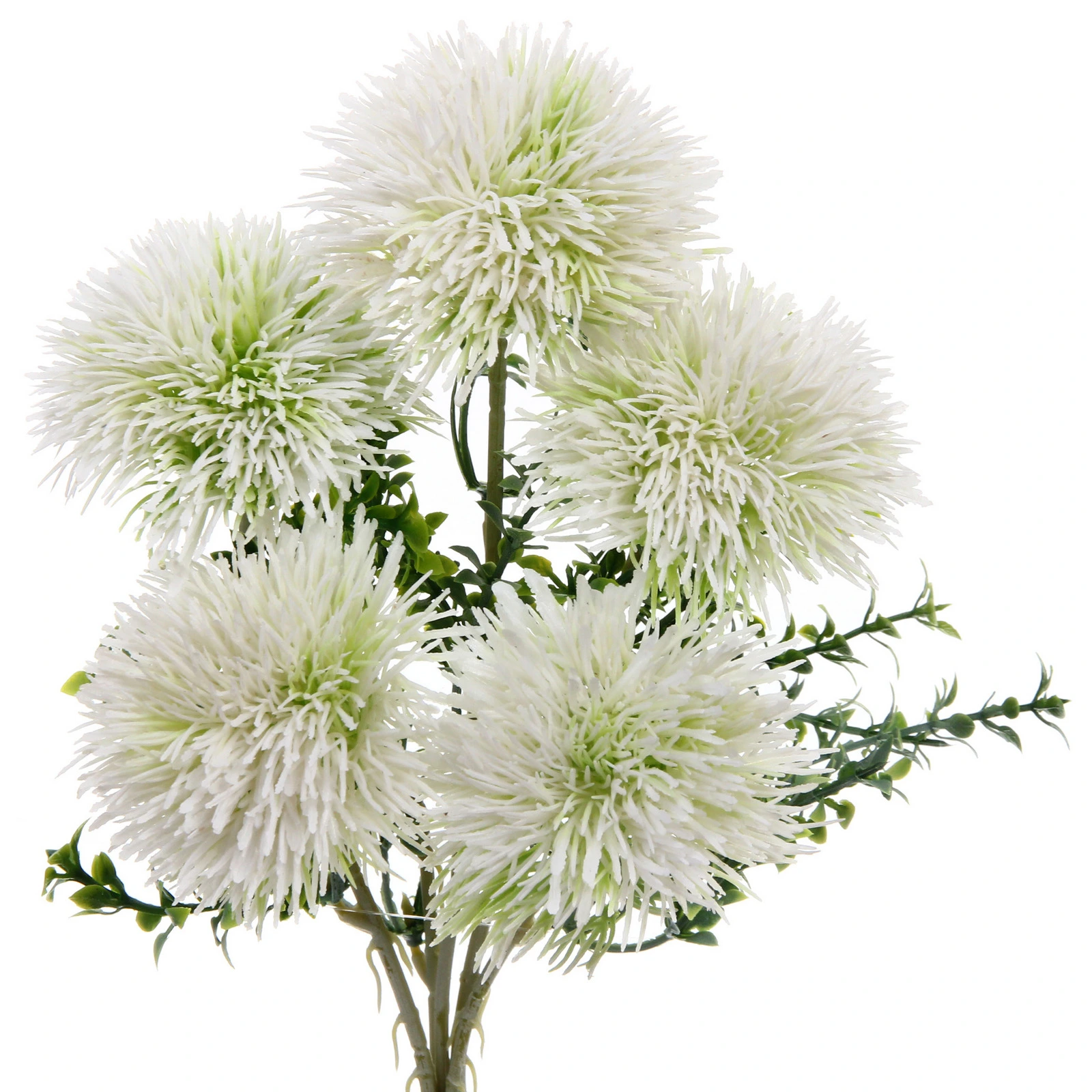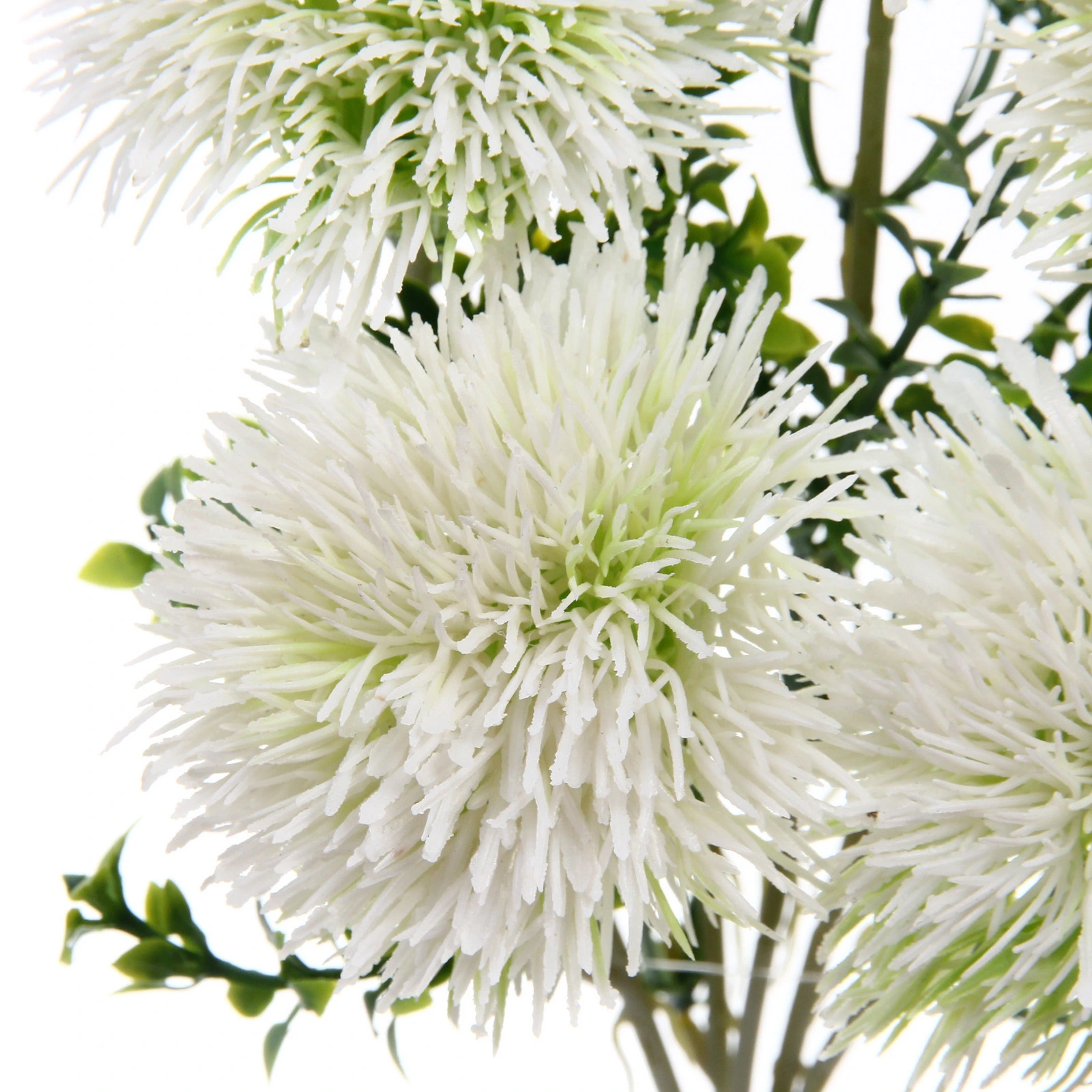- Правдоподобная красота: Каждый цветок искусно воспроизводит натуральный одуванчик — от формы пушистого шара до плавного перехода от белого к светло-зелёному в сердцевине и зелёных зазубренных листьев.