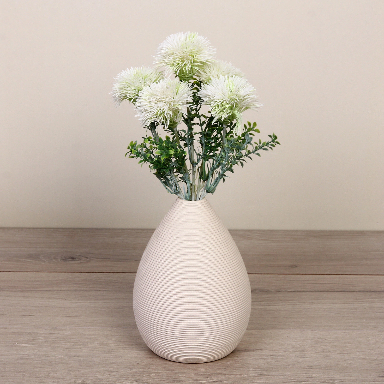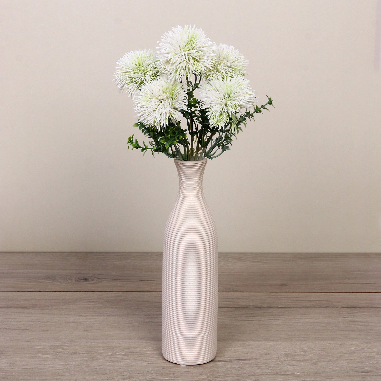 Букет выполнен с вниманием к деталям: зелёные стебли имитируют натуральные, листва выглядит свежей и реалистичной. Белый цвет соцветий универсален и легко впишется в любую цветовую палитру интерьера — от классического до скандинавского стиля. Такой декор не боится сквозняков, перепадов температуры и не требует полива, что делает его идеальным для занятых людей.