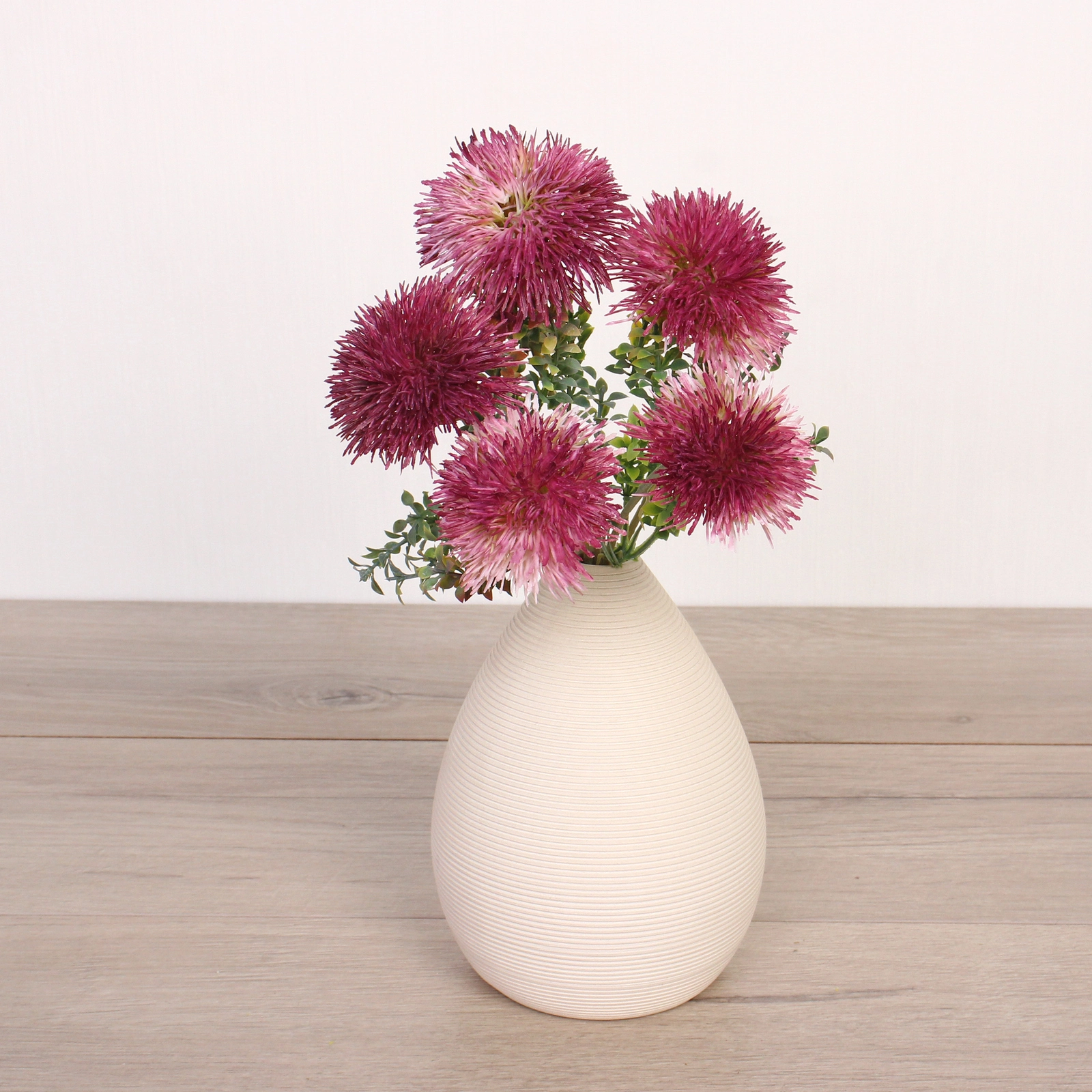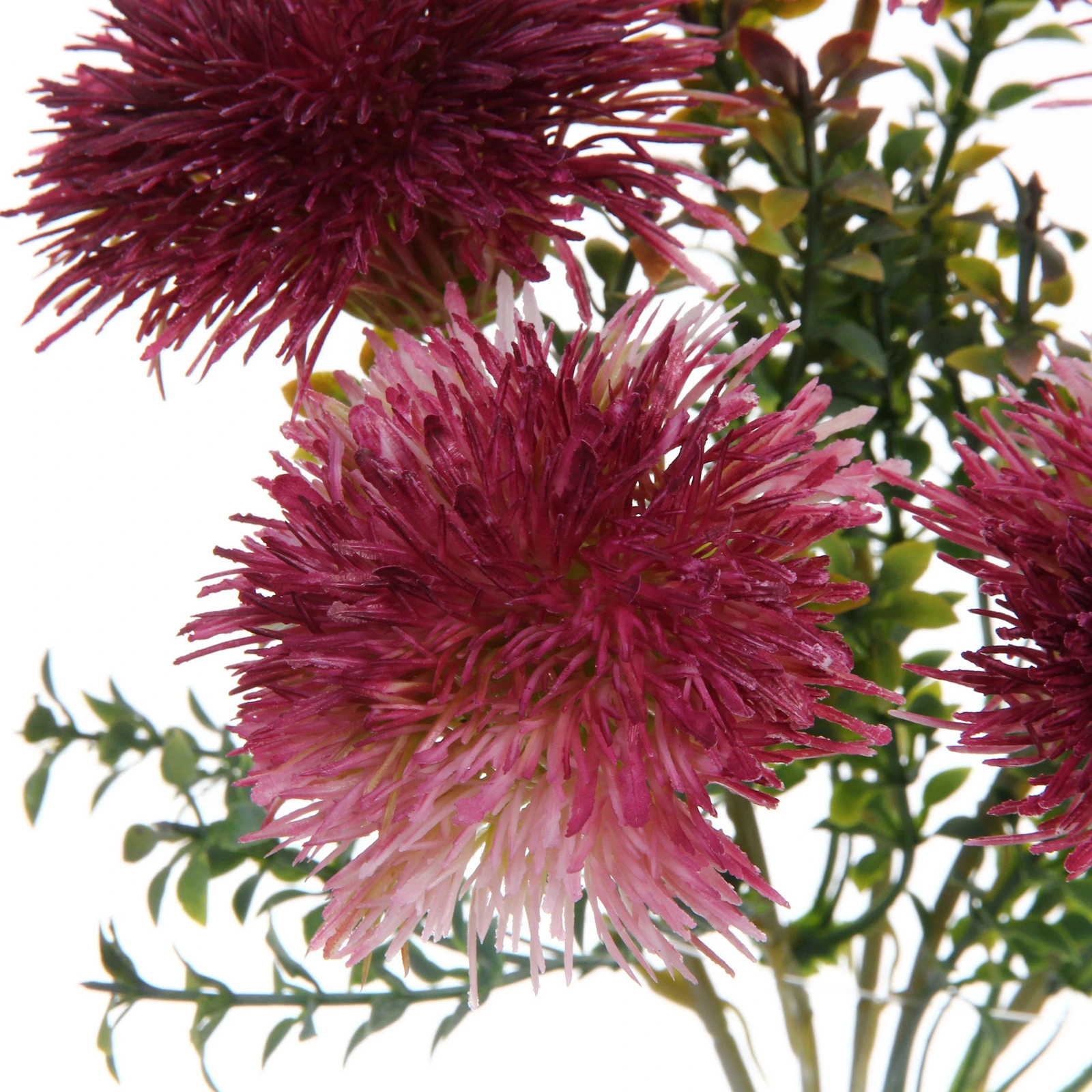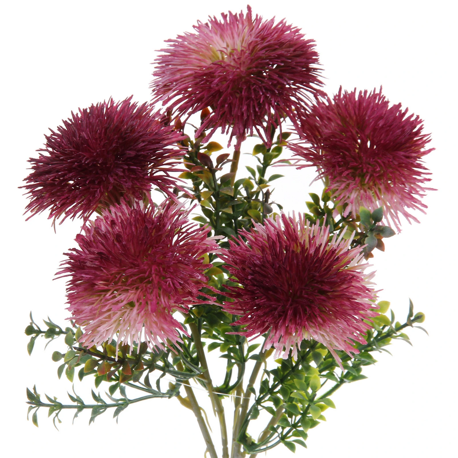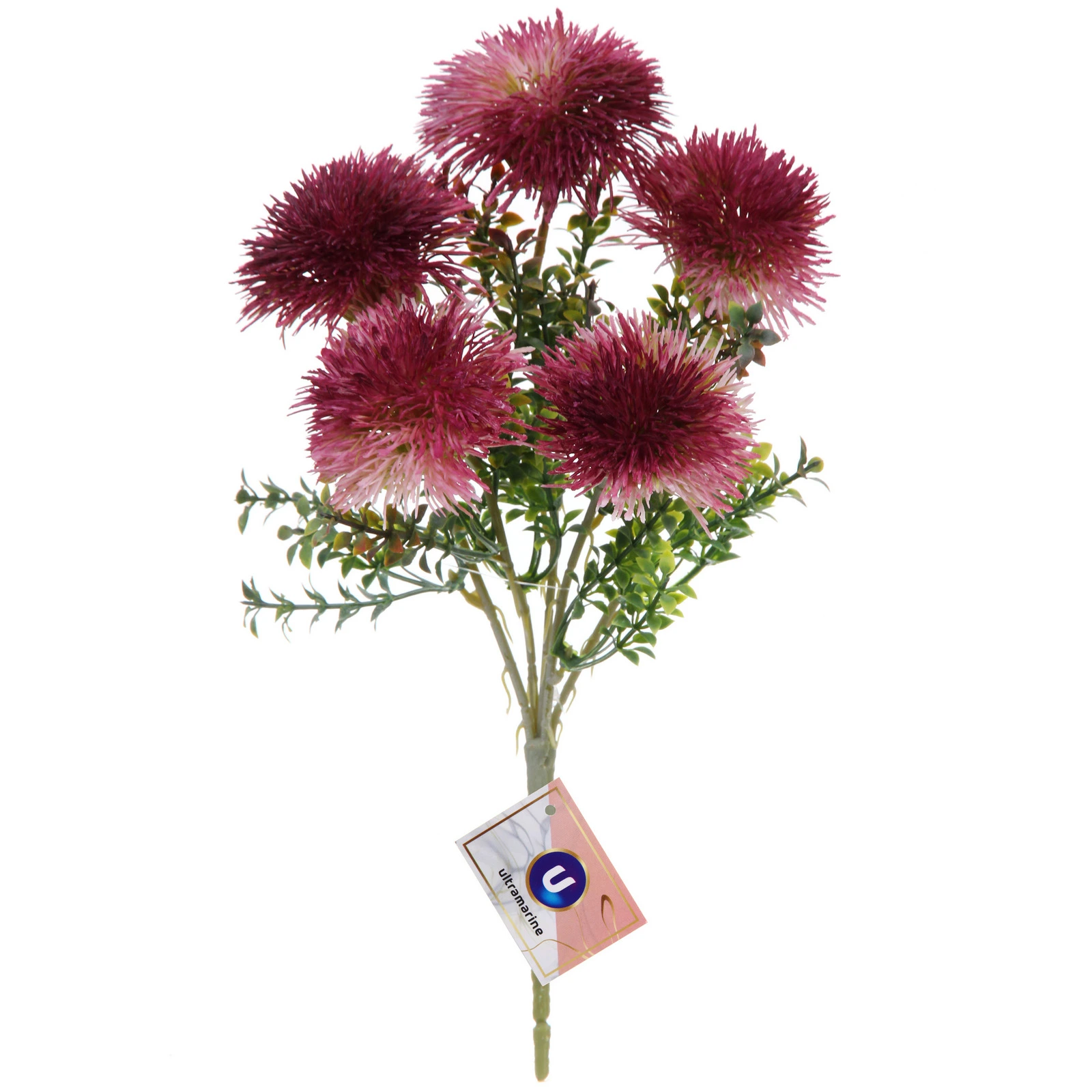 Букет состоит из пяти крупных шарообразных соцветий, закрепленных на общем пучке разветвленных стеблей с множеством мелких зеленых листьев. Общая высота композиции составляет около 32 см. Материал изготовления — качественный пластик, который обеспечивает прочность и сохраняет безупречный внешний вид. Цветовая гамма — лилово-розовый градиент.