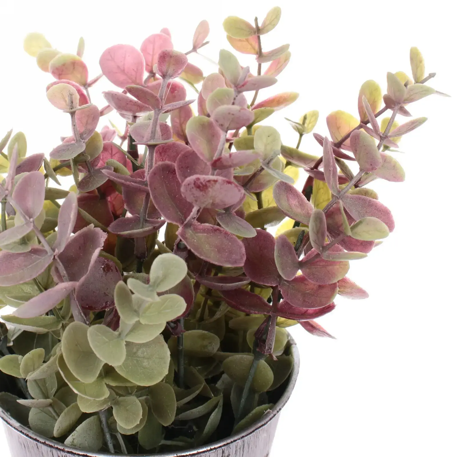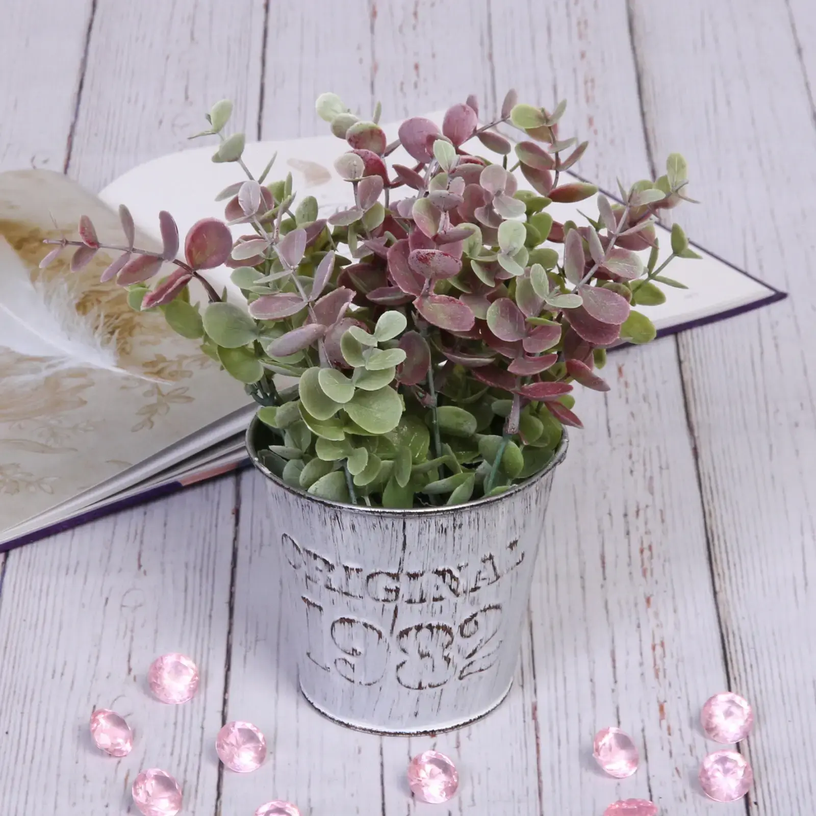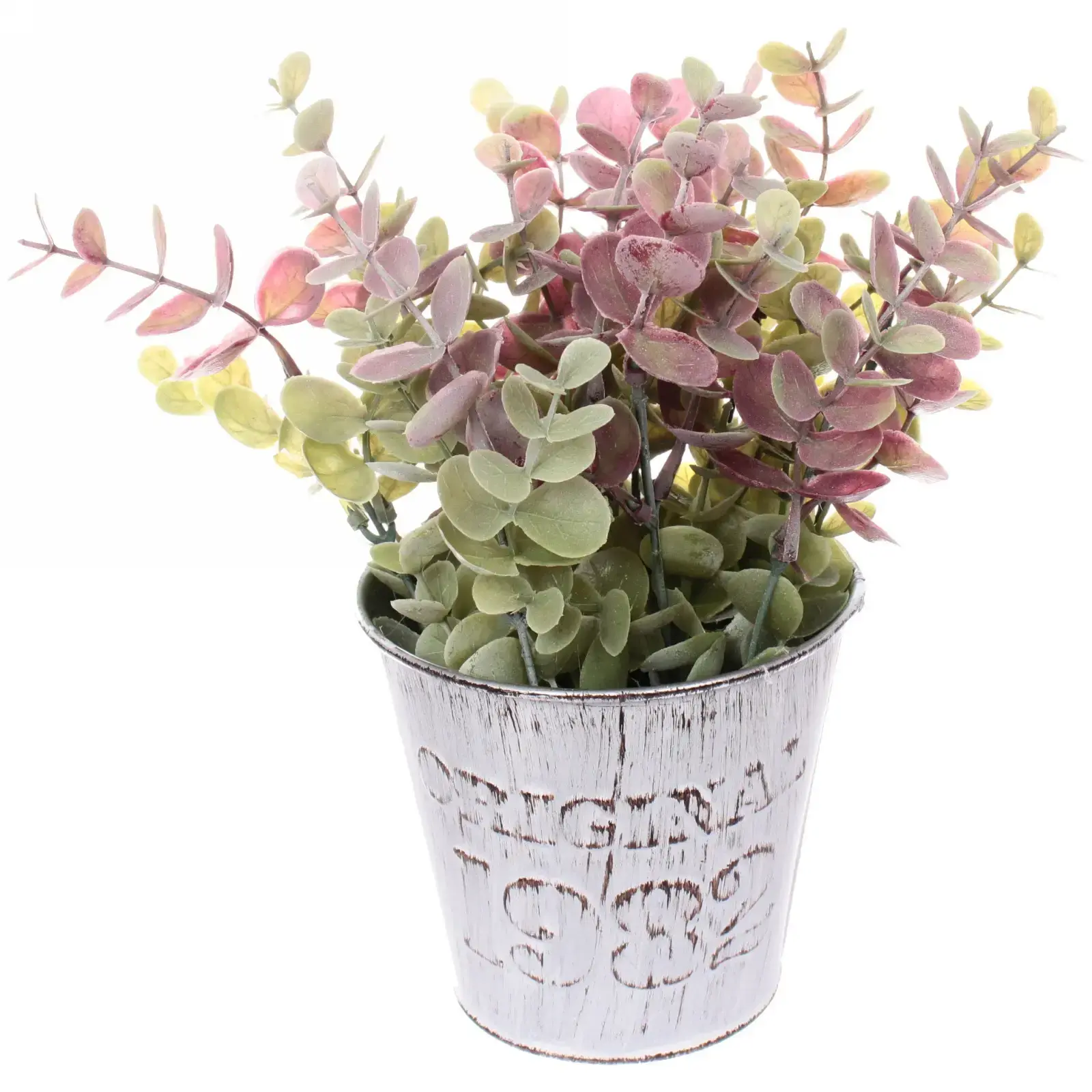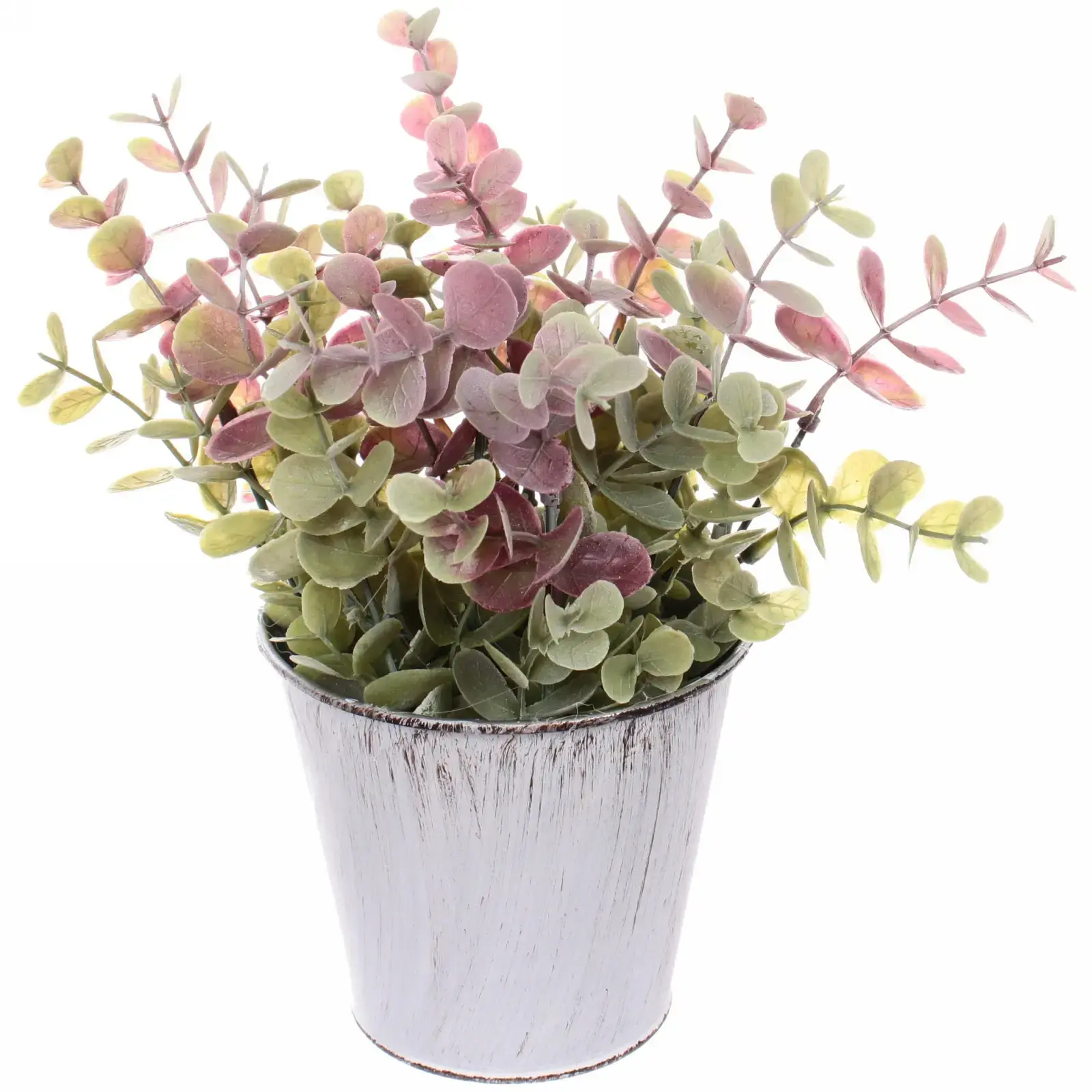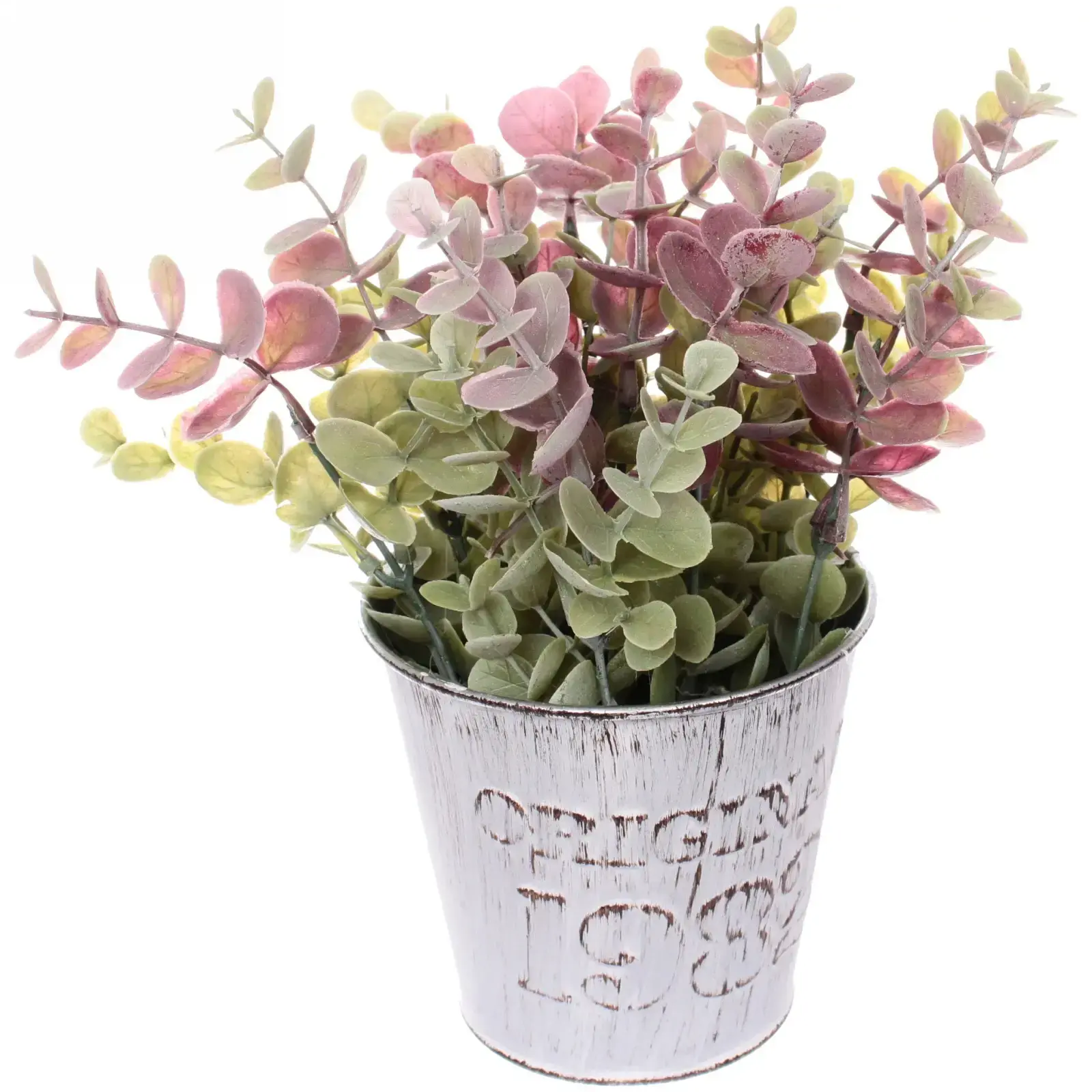 Цветок выполнен из качественных материалов: металл и пластик, что обеспечивает его долговечность и устойчивость к внешним воздействиям. Белый кашпо с текстурой, напоминающей старинный, добавляет изысканности и стиля. Листья растения имеют нежные оттенки зеленого и розового, создавая эффект естественности и свежести.