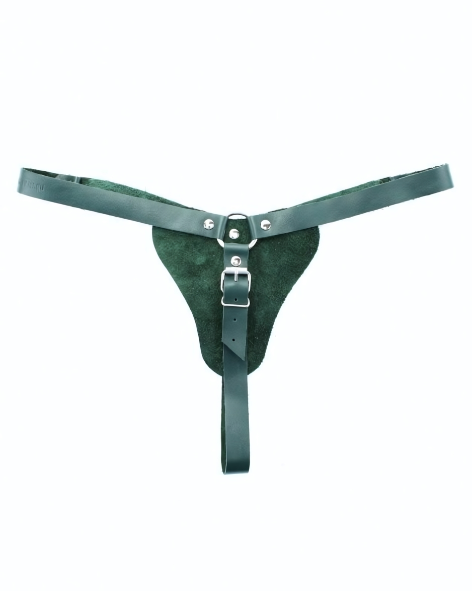 Почему стоит выбрать именно эти трусики? Во-первых, они выполнены из высококачественной натуральной кожи, что гарантирует комфорт при носке. Во-вторых, их уникальный дизайн с металлическим кольцом и регулируемыми ремнями позволяет создать идеальную посадку и подчеркнуть ваши формы. В-третьих, изумрудный цвет добавляет нотку элегантности и сексуальности, что делает их отличным выбором для особых случаев.