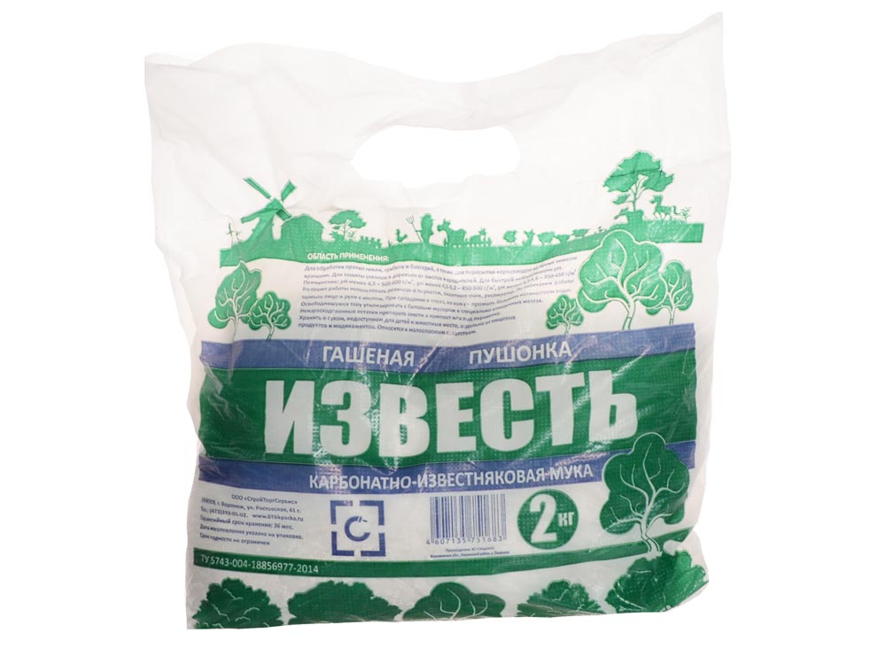 Известь гашёная Пушонка 2кг СтройТоргСервис г.Воронеж применяется для обработки против гнили, грибков и бактерий, а также для пересыпки корнеплодов во время зимнего хранения.