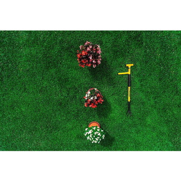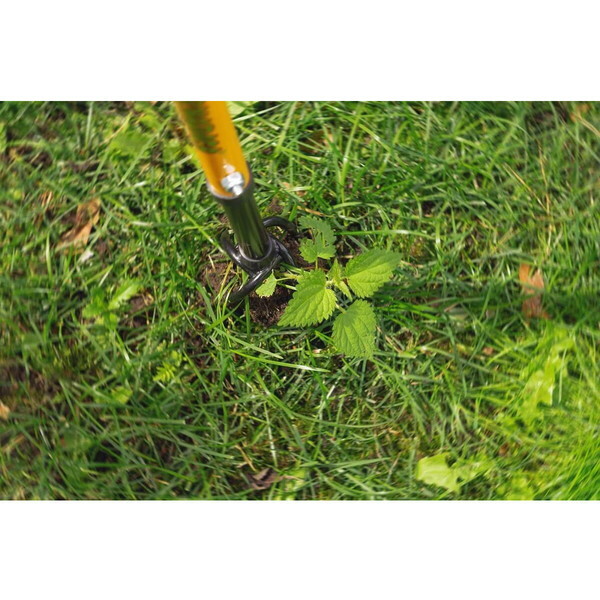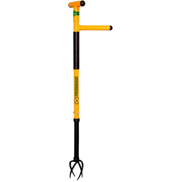 Извлекатель оснащен 4 кованными спиральными зубьями, которые эффективно захватывают корни сорняков, позволяя полностью их удалить. Длина инструмента составляет 95 см, что обеспечивает комфортное использование без необходимости наклона. Регулируемая рукоятка позволяет выбрать оптимальную длину для каждого пользователя, а поворотная Т-образная ручка обеспечивает легкость в управлении.