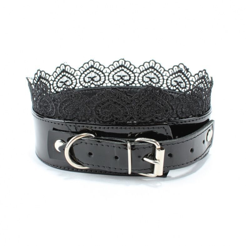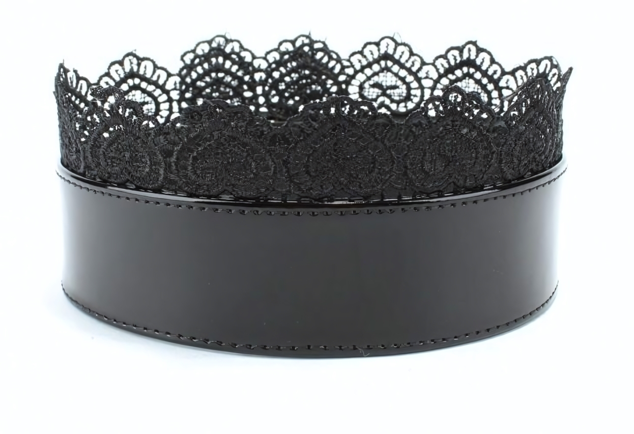 Чёрный ошейник из натуральной кожи с кружевным декором сочетает в себе эстетику, комфорт и надёжность. Идеальный баланс между изысканностью и функциональностью для ценителей стиля в интимных играх.