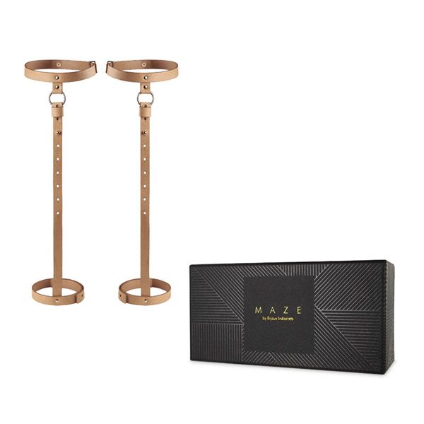 Дизайн подтяжек «MAZE» от Bijoux Indiscrets отличается продуманной простотой. Два круглых ремешка соединены вертикальной полосой с металлическим кольцом, создавая геометрически выверенную композицию. Коричневый цвет искусственной кожи выглядит благородно и универсально, подходя к различным оттенкам кожи и цветам одежды. Металлические элементы (кольца и заклёпки) добавляют аксессуару современный индустриальный акцент.