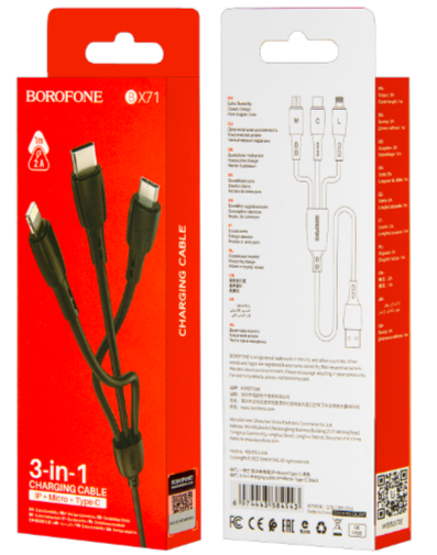 Забудьте о проблеме поиска подходящего зарядного кабеля. Кабель Borofone BX71 объединяет три популярных разъема: MicroUSB, Lightning и Type-C в одном компактном решении.