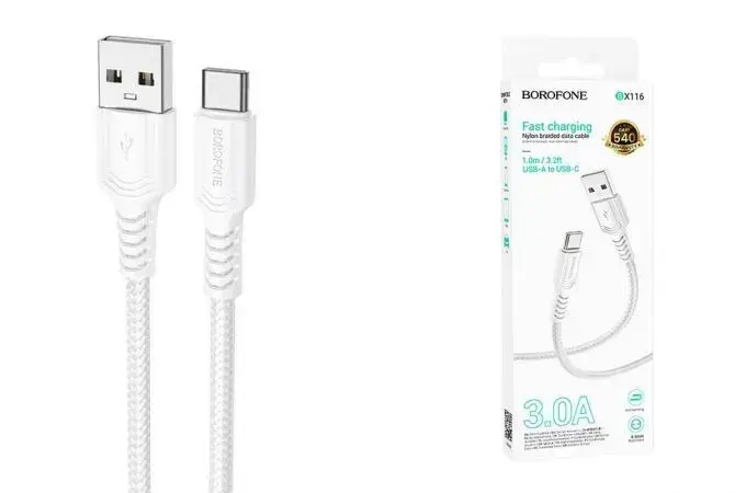 Плетёный кабель USB-A — Type-C длиной 1.8 метра обеспечивает стабильную передачу данных и быструю зарядку устройств до 3.0A. Его дизайн сочетает прочность и элегантный внешний вид — белая нейлоновая оплётка защищает провод от износа, скручиваний и заломов, а усиленные места возле разъёмов продлевают срок службы.