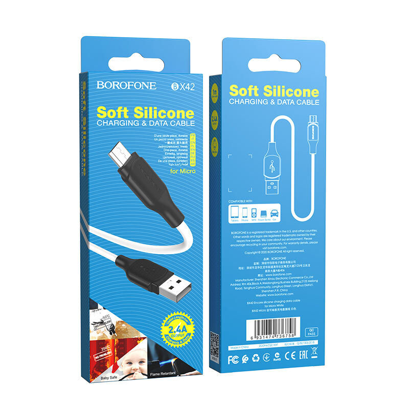 Кабель зарядный BX42 microUSB, силикон пищевой, 1м, 2.4A, белый, безопасный для детей, огнестойкий