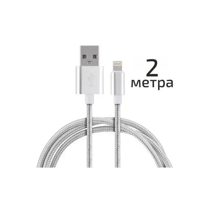 Тканевая оплетка серебристого цвета не скручивается и сохраняет эстетичный вид. Длина 2 метра позволяет удобно разместить устройство во время зарядки. Эргономичные разъемы Lightning и USB-A с четкой маркировкой сторон.