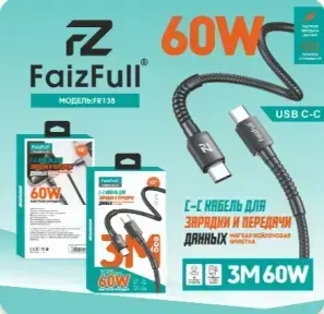 Кабель USB-C «FaizFull FR138» 60W, нейлоновый, 1м, черный, быстрая зарядка