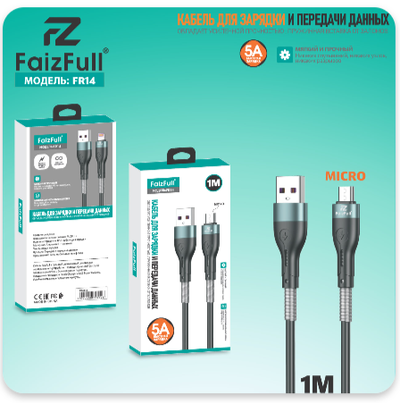 Представляем кабель USB-microUSB 'FaizFull FR14' — ваш надежный помощник в мире современных гаджетов. Сочетая в себе прочность силиконовой оплетки и высокую пропускную способность в 5А, этот кабель станет незаменимым аксессуаром для вашего устройства.